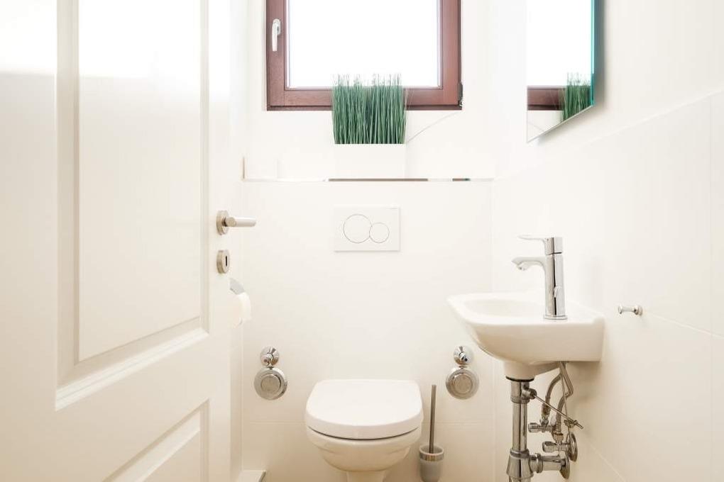 Das Badezimmer I verfügt über einen Waschtisch, ein WC und eine große ebenerdige Dusche. Zusätzlich verfügt das Ferienappartement über ein Gäste WC.