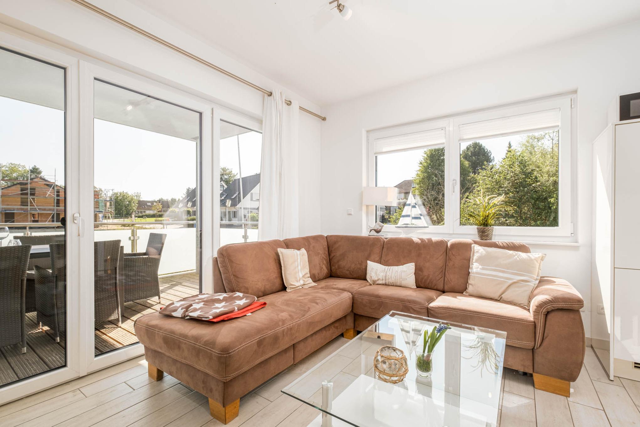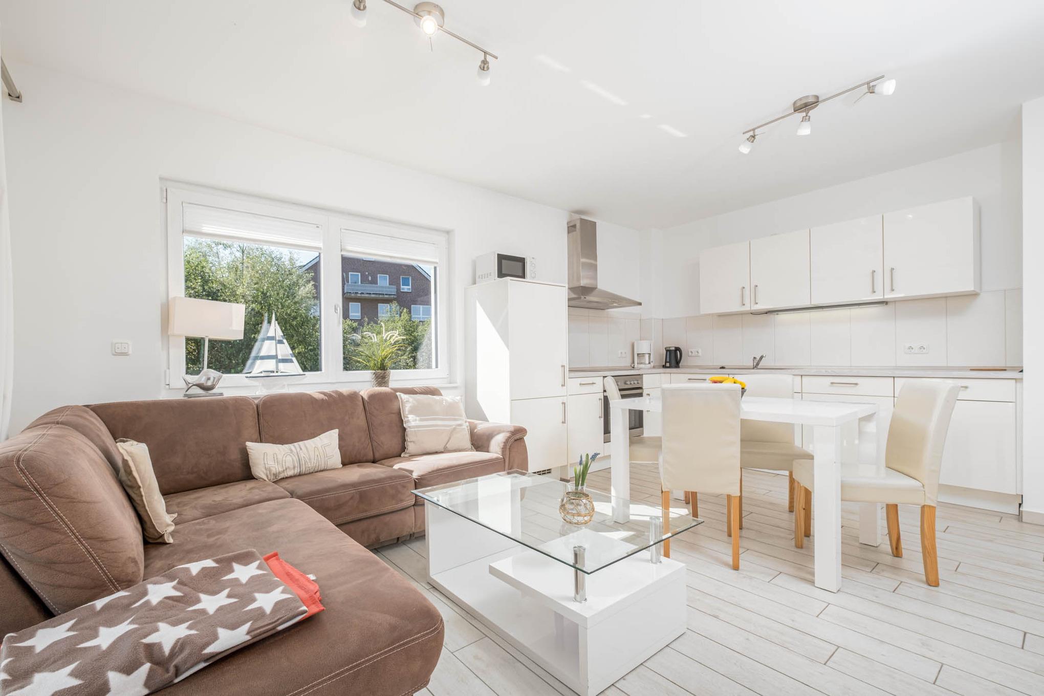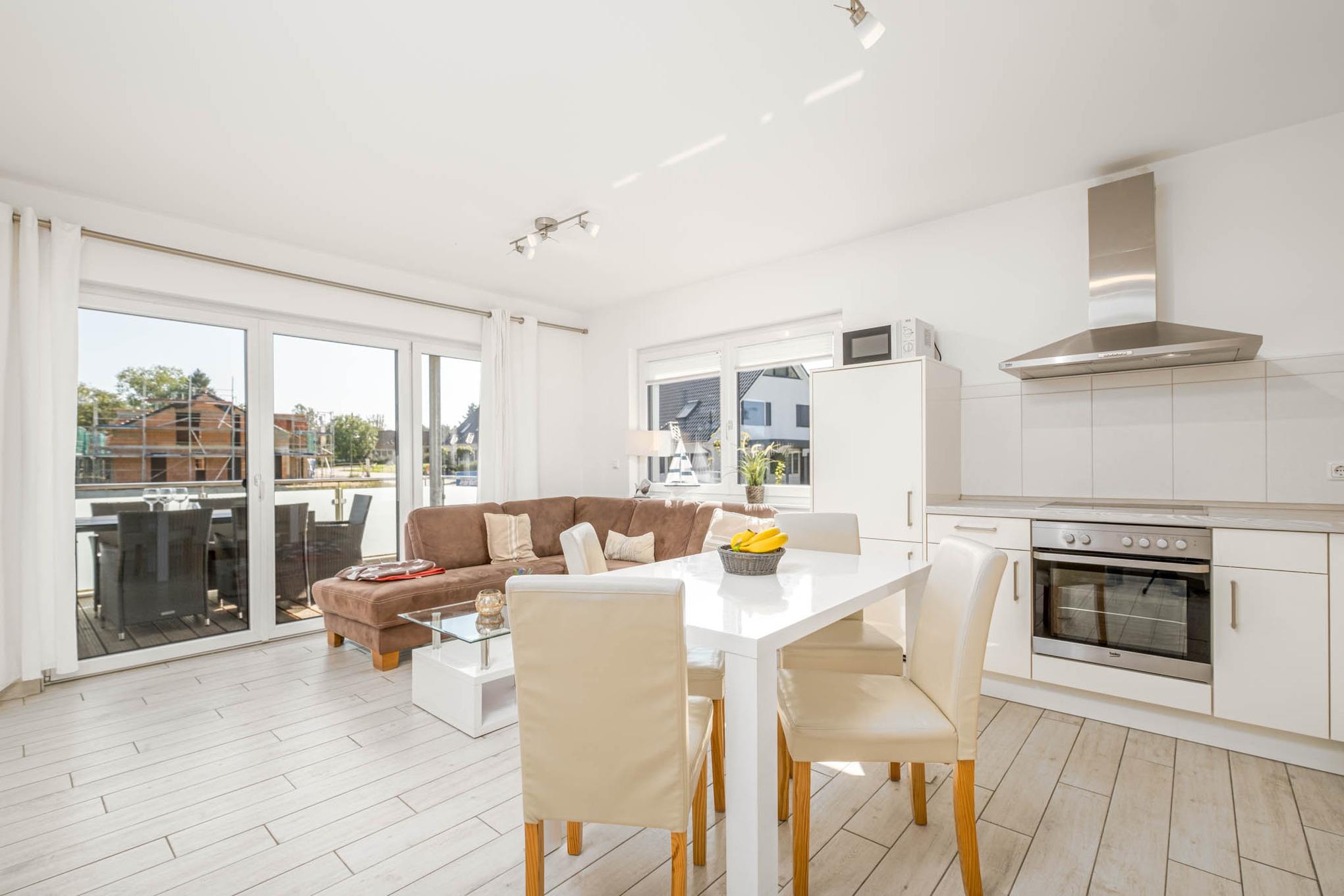 In der Strandzeit #3 begrüßt Sie eine komplett neue und sehr moderne 3-Zimmer-Ferienwohnung für maximal 4 Personen in der 1.Etage mit überdachtem Balkon in Süd-Ausrichtung. Das Wohnzimmer ist mit einer Couchgarnitur, einem Flatscreen-TV, einem großzügigen Essbereich sowie der Einbauküche eingerichtet. Die Küche ist mit einem Cerankochfeld, Backofen, Geschirrspüler, Mikrowelle, Toaster und einem Wasserkocher ausgestattet.