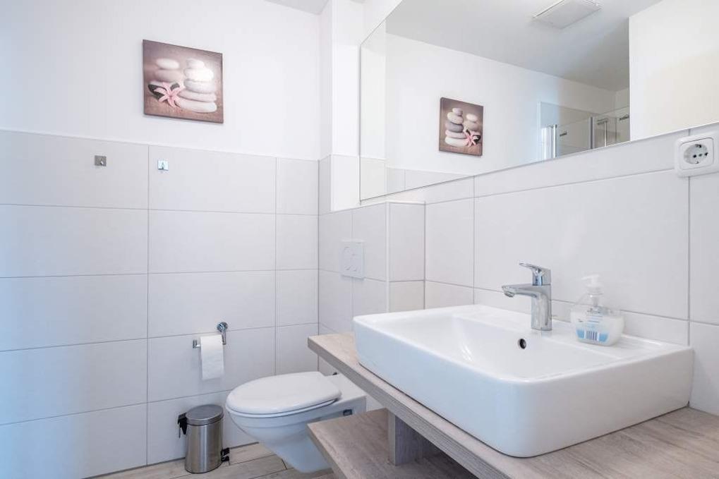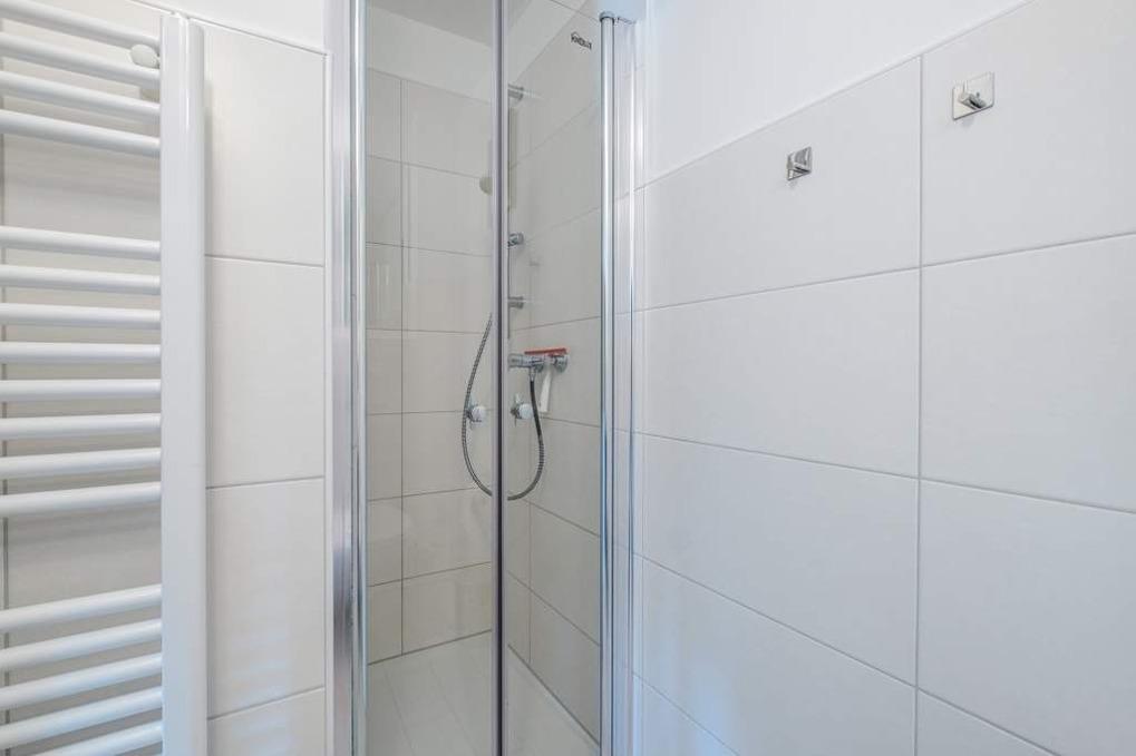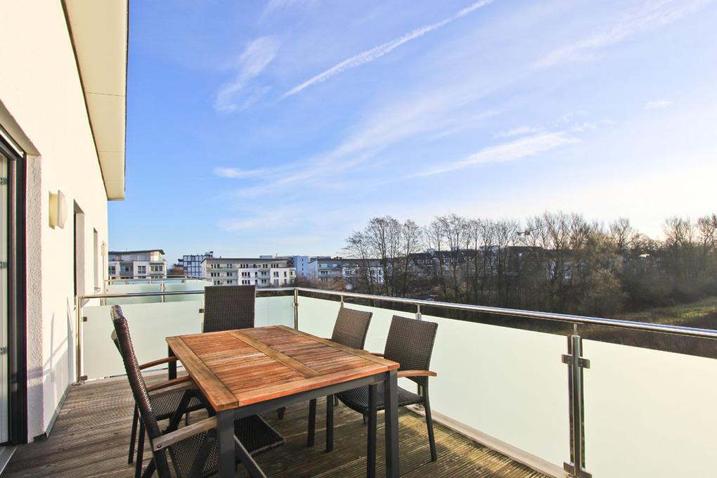 Das Badezimmer der Scharbeutz Ferienwohnung ist mit einer Dusche ausgestattet. Der große und möblierte Balkon zur Sonnenseite rundet diese wunderschöne Scharbeutz Ferienwohnung ab.