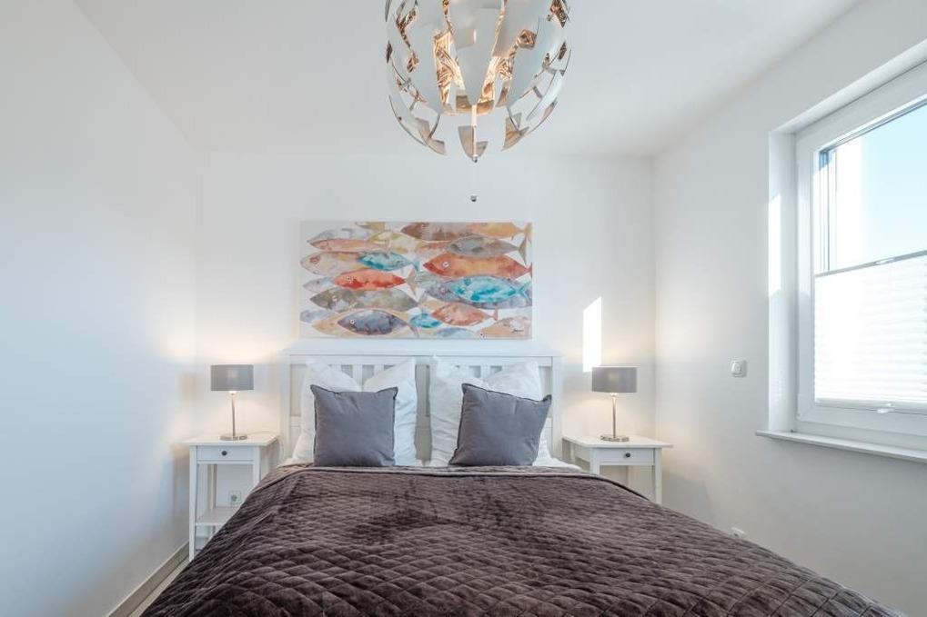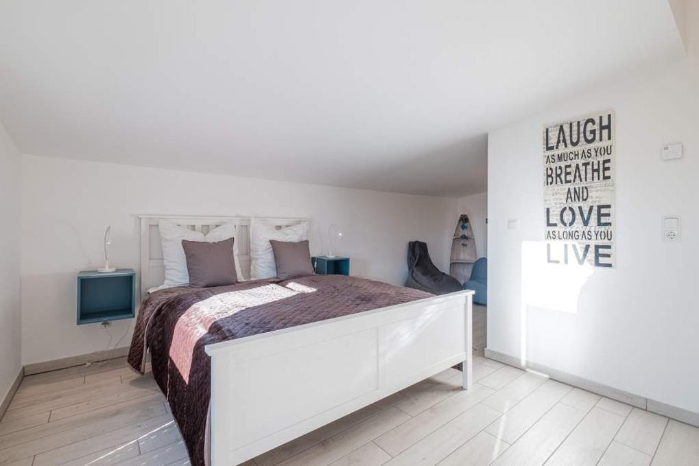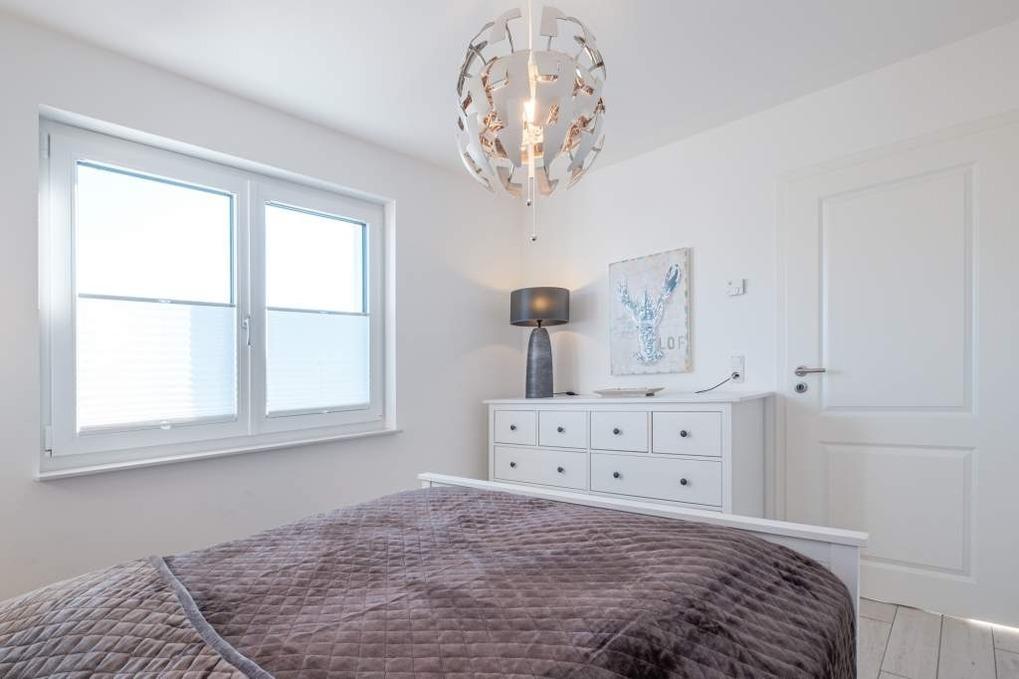 Die beiden separaten Schlafzimmer sind jeweils mit einem Doppelbett (160x200cm) und einem Kleiderschrank eingerichtet. Das Schlafzimmer I besitzt zusätzlich eine Sitzecke, die zur Entspannung einlädt und einen schönen Rückzugsort bietet. Im Flur befindet sich ein geräumiger Einbauschrank.