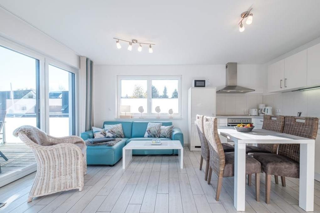 Das Appartement Strandzeit #5 befindet sich in der 2. Etage mit Balkon in Süd-Ausrichtung. Hier finden 4 Personen ausreichend Platz. Das Wohnzimmer ist mit einer gemütlichen Couchgarnitur, einem Flatscreen-TV, einer Essecke und der modernen Küche mit Backofen, Cerankochfeld, Mikrowelle und Geschirrspüler eingerichtet.