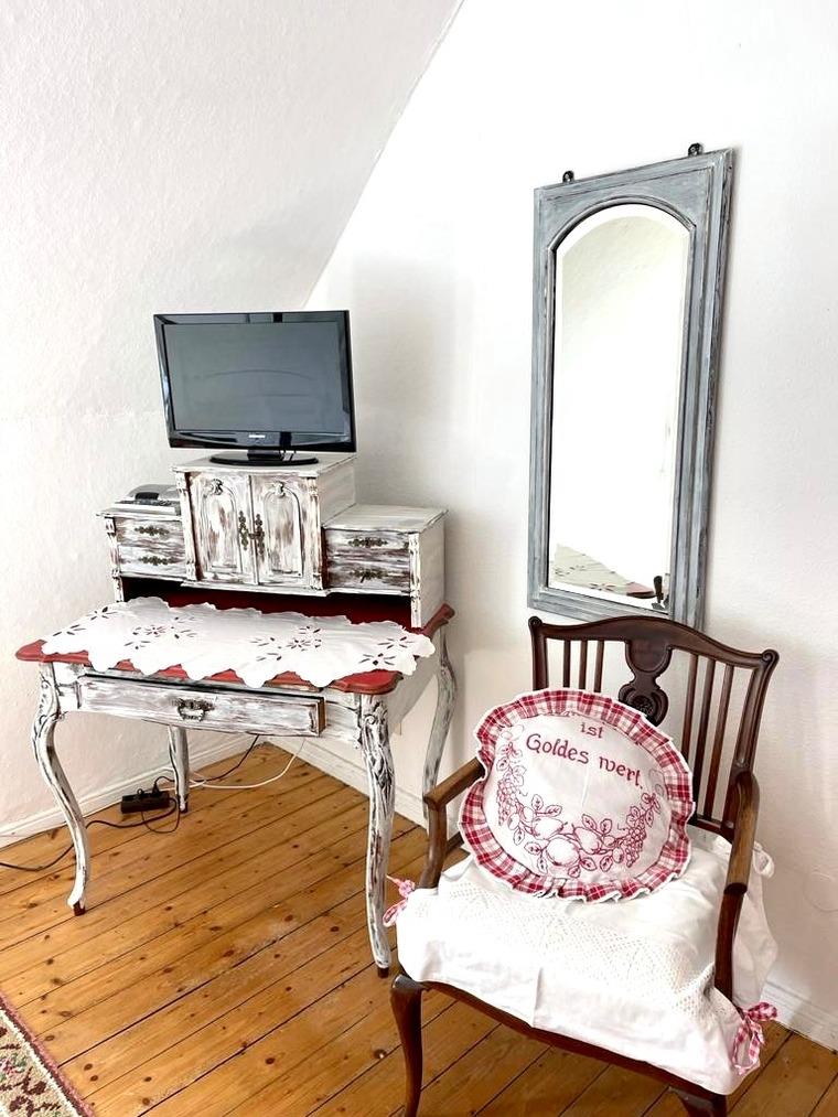 Dieses Zimmer ist ausgestattet mit einem romantischen Himmelbett (1.40m x 2.00m). Auch dieses Zimmer verfügt über eine gemütliche Sitzecke, hat Internetfernsehn und Radio. Das Ferienzimmer Nr. 9 liegt auf der linken Treppenseite und verfügt über ein gemeinsames, separates, großes Bad, welches auch mit den Gästen der Ferienzimmer 10 und 11 zur Benutzung zu teilen ist, wenn diese Ferienzimmer ebenfalls belegt sind. Die Küchenzeile versteht sich als Kühlschrank, Kaffeemaschine und Wasserkocher auf der Gemeinschaftsdiele. Frühstück kann separat dazu gebucht werden.