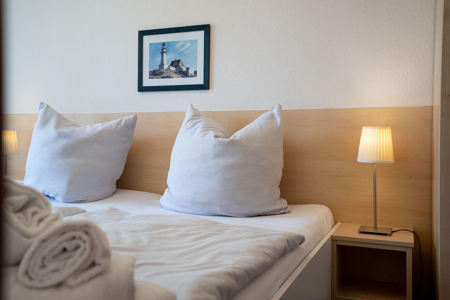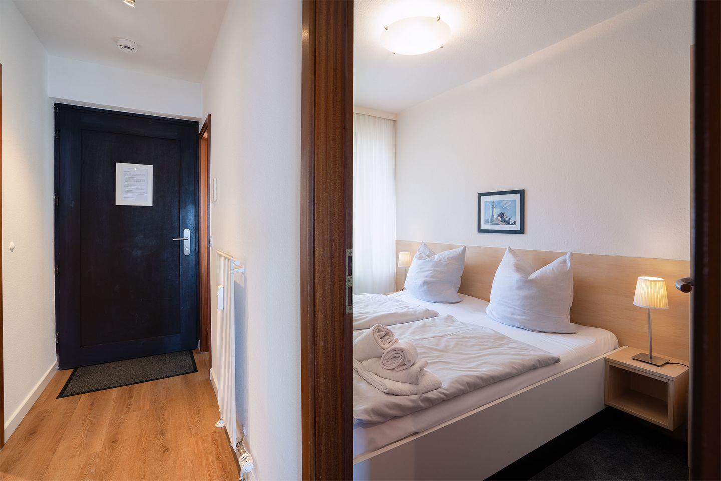 Das Appartement hat zwei Schlafzimmer, davon eines mit einem Doppelbett (1,80 x 2m/Einzelmatratzen), Nachttischen und einen Kleiderschrank. In dem anderen Schlafzimmer befinden sich zwei Einzelbetten (je 90 x 1,90) und ein kleiner Schreibtisch.