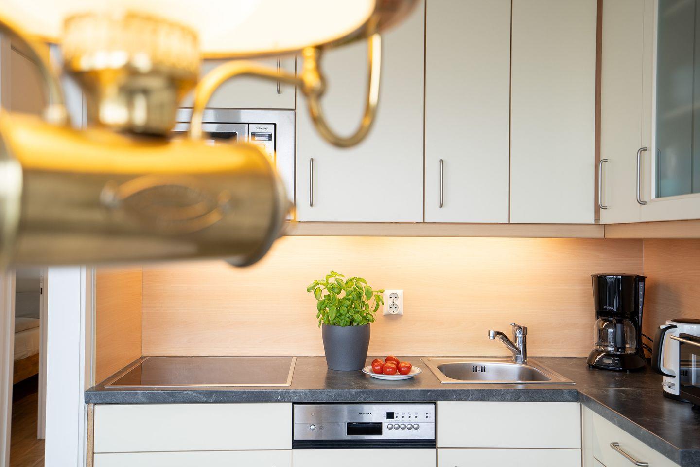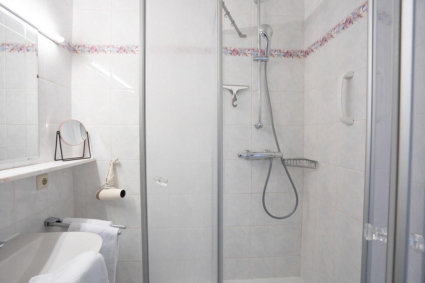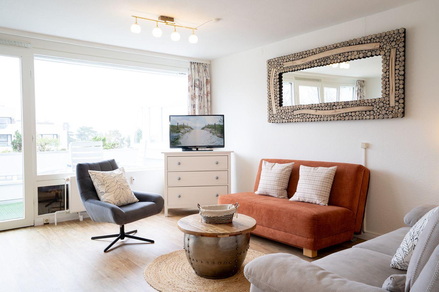 Das 58 qm große 2-Zimmer-Appartement liegt im 3. OG und ist bequem mit dem Lift erreichbar. Von der großen Sonnenterrasse haben Sie einen schönen Blick aufs Meer und eine Markise schützt vor der Sonne. Der Wohnraum ist mit einem hochwertigen PVC-Boden ausgelegt und es gibt eine Ledergarnitur, Sessel, Couchtisch, TV, sowie eine neue Schlafcouch für eine Person (1,40 x 2m). Die offene Einbauküche ist unter anderem mit Geschirrspüler und Mikrowelle nebst Essplatz ausgestattet. Im Schlafraum finden Sie ein gemütliches Doppelbett (1,60 x 2 m / Einzelmatratzen). Das Bad verfügt über eine Eckdusche, Waschtisch, WC, sowie einen Föhn. Das Rauchen und Tierhaltung sind nicht erlaubt, wir bitten um entsprechende Beachtung! Der PKW-Außenstellplatz ist inklusive. Waschmaschine und Trockner sind im Haus gegen Gebühr nutzbar. Auch das WLAN ist inkl., die Nutzung erfolgt jedoch auf eigene Verantwortung (bei Störung kein Ersatzanspruch).