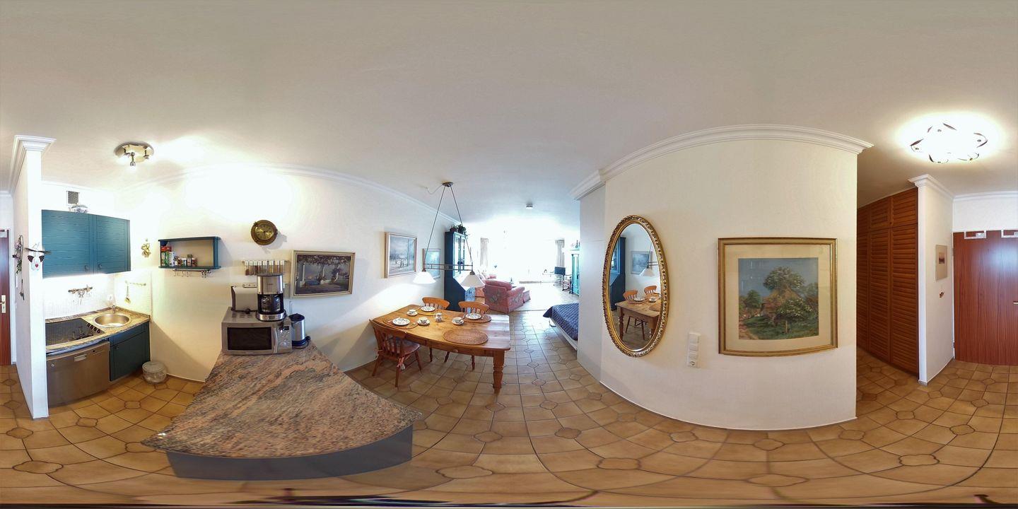 Die offene Einbauküche mit Geschirrspüler und Mikrowelle ist mit allen nötigen Utensilien versehen. Der angeschlossene Essplatz bietet Platz für 2 Personen.