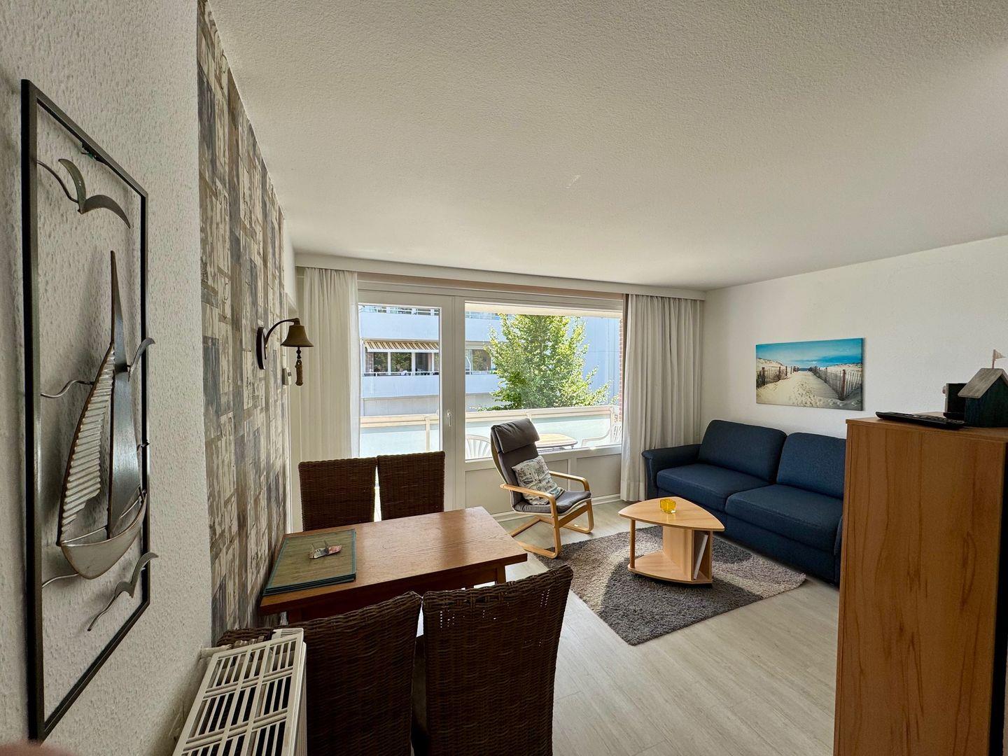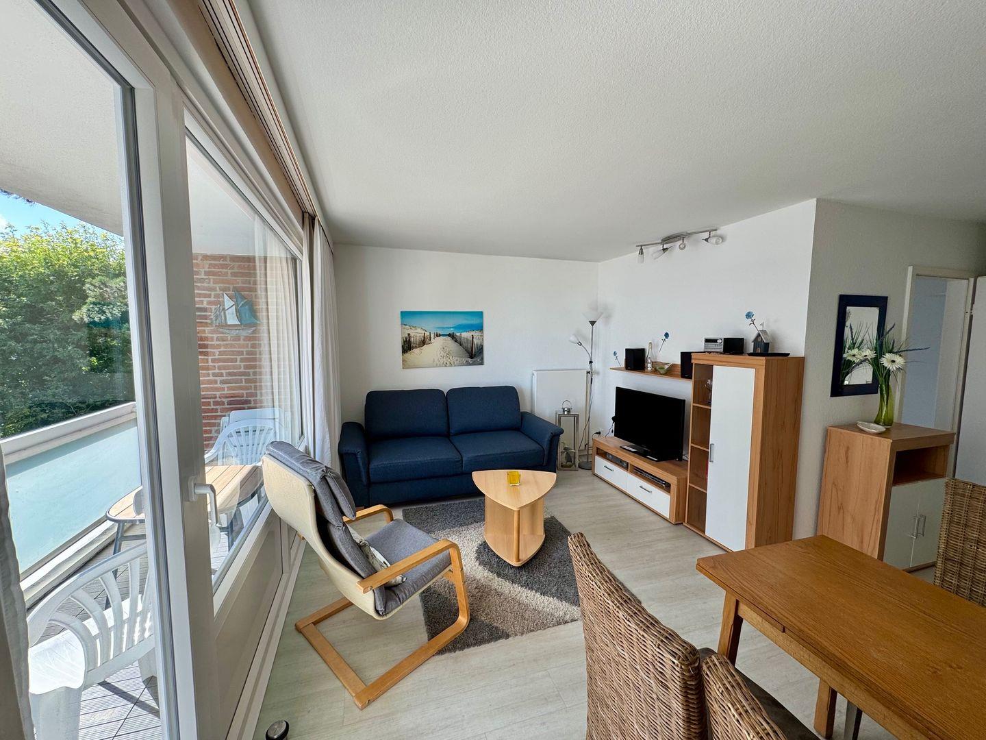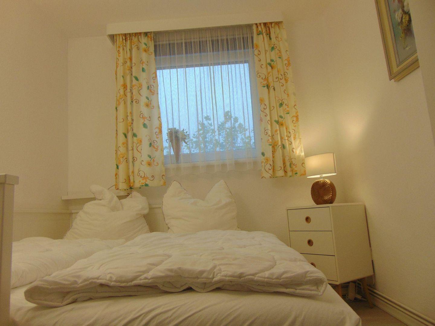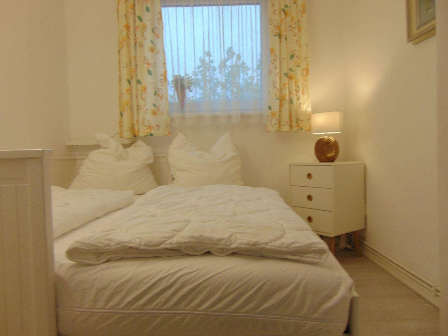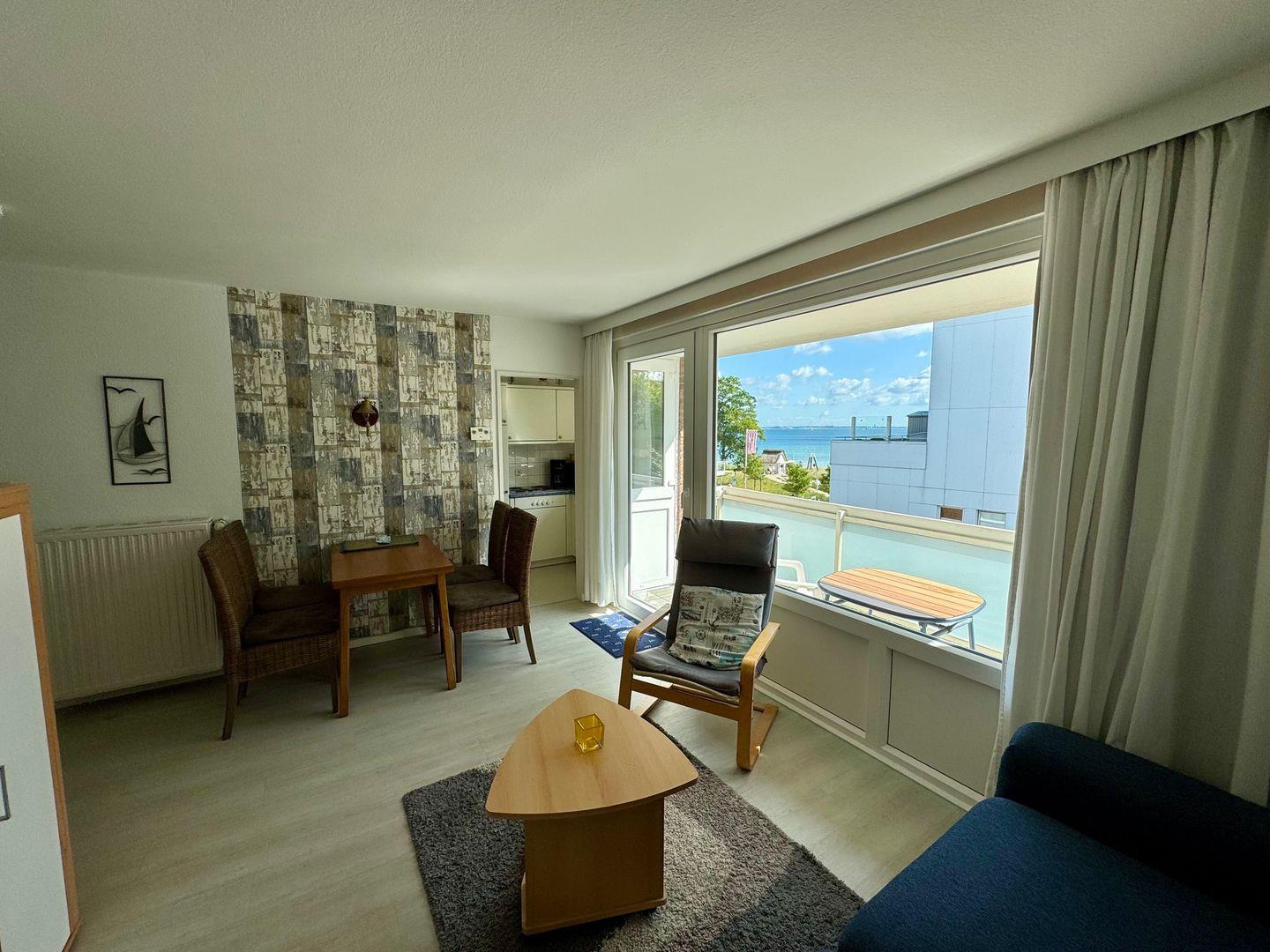 Hier wird der Urlaub zu einem schönen Erlebnis. Das gemütliche und liebevoll eingerichtete, ca. 40 m 2 große 2- Raum-Apartment im 2. OG verfügt über einen hellen und gemütlichen Wohnraum mit integriertem Essplatz. Es ist eine Polstergarnitur vorhanden, welche zur Schlafcouch umwandelbar ist. Um gemütliche Abende zu verbringen, steht Ihnen ein Flachbild-TV, DVD-Player und eine HiFi-Anlage mit CD-Player zur Verfügung. Die separate Einbauküche ist komplett ausgestattet, u.a. mit einer Filtermaschine, Mikrowelle mit Grill und Heißluft. Ein Kleinkinderhochstuhl ist ebenfalls in der Wohnung vorhanden. Der Schlafraum verfügt über ein Doppelbett, (160 cm Bett, 2 x 80 cm Matratzen), das sich zu einem Einzelbett umbauen lässt. Neuwertiges Duschbad / WC mit Fliesenboden. Der Fußboden im Wohn- und im Schlafzimmer wurde mit einem Design - Fußboden ausgestattet, ebenso wie der Flur. Die Wohnung verfügt über einen großen Teilseeblick-Balkon. In diesem Apartment ist das Rauchen, sowie Haustiere nicht erlaubt. Wir bitten um entsprechende Beachtung. Ein kostenfreier WLAN Anschluss steht Ihnen zur Verfügung (bei Störung kein Ersatzanspruch). Die Nutzung des Pkw-Außenstellplatzes ist im Preis inbegriffen (mittlerer Stellplatz vor dem Haus).