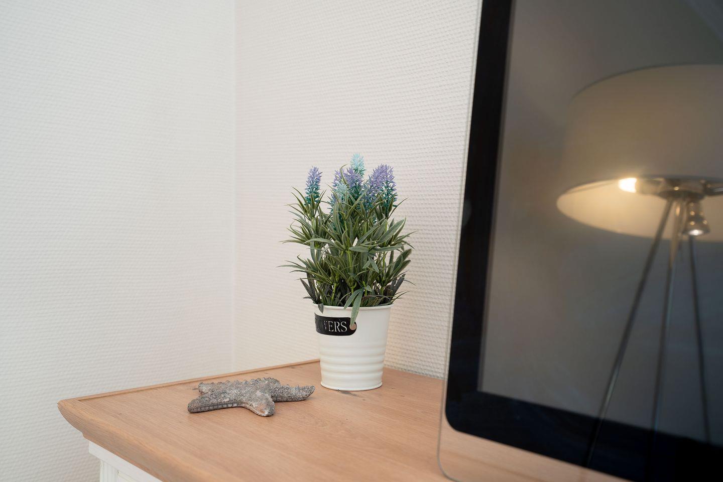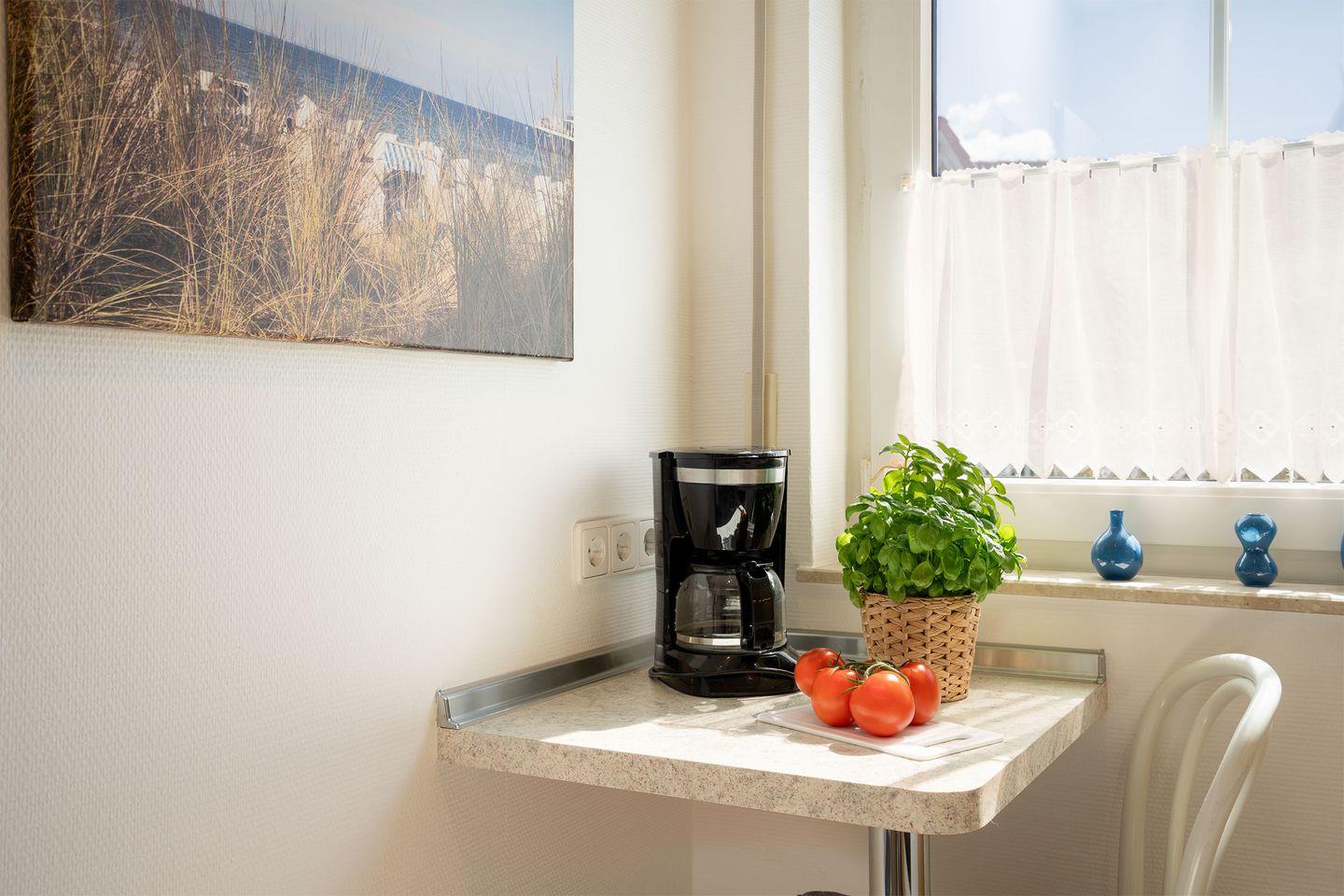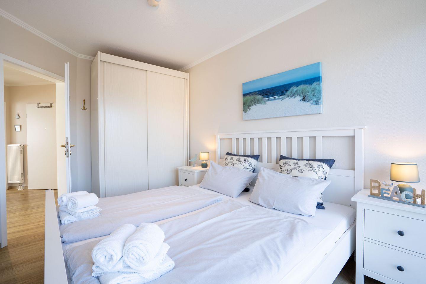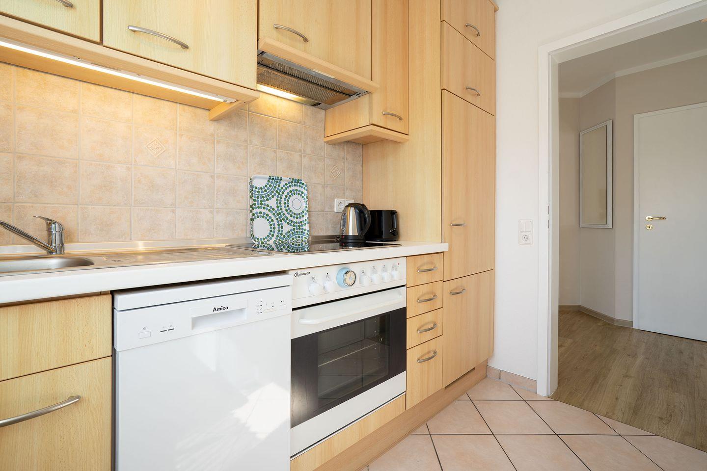Die separate geflieste Einbauküche verfügt über eine Komplettausstattung inkl. Ceranfeld, Backofen und Kaffeemaschine, Wasserkocher, Spülmaschine nebst Esstisch und Stühlen. Separates Schlafzimmer mit Doppelbett (2x 90cm x 2m), Nachttisch, Kleiderschrank und Außenjalousie am Fenster sowie Ausgang zum Balkon. Modernes gefliestes Vollbad mit Fenster. In diesem Appartement ist das Rauchen nicht erlaubt. Wir bitten um entsprechende Beachtung! Die Wohnung eignet sich wunderbar für Familien mit Kindern oder auch Gäste mit Hunden - nicht weit entfernt befindet sich ein großer Spiel- und Fußballplatz sowie Wiesen und der Wald. Im Sommer können Sie sich mit Ihrem vierbeinigen Freund an den ausgewiesenen Strandabschnitten austoben. Von Anfang Oktober bis Ende März sind alle Strandabschnitte für Hunde freigegeben. Die PKW-Stellplatznutzung ist inklusive.