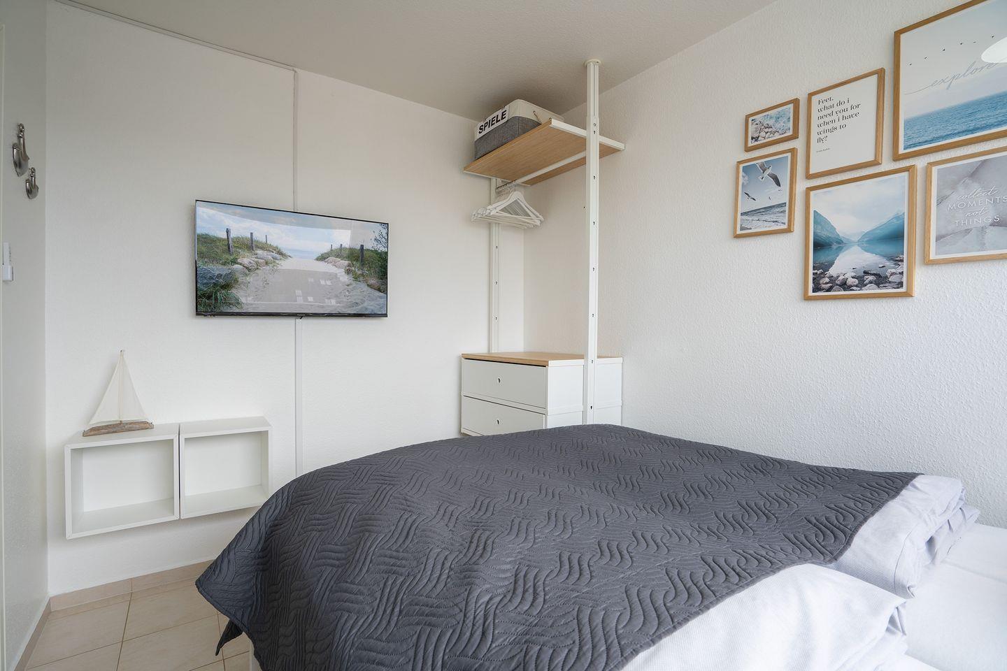Darüber hinaus verfügt das Appartement über ein separates Schlafzimmer, das mit Doppelbett (Matratzen 2 x 90) und einem Kleiderschrank ausgestattet ist. Es handelt sich bei den Betten jeweils um Einzelmatratzen.