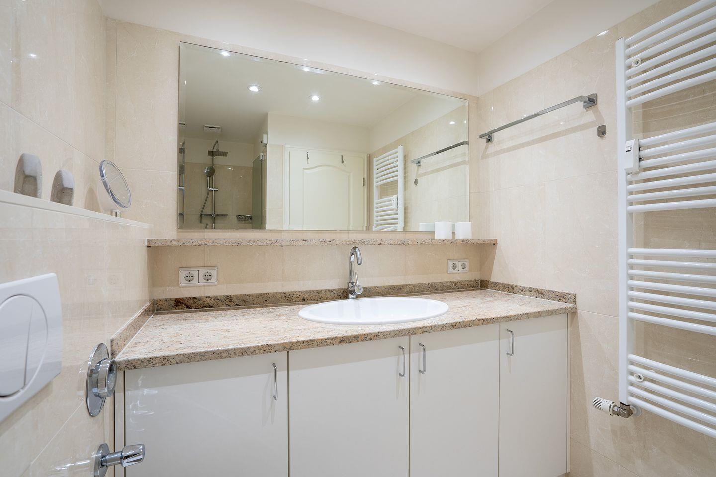 Das moderne Duschbad/WC ist mit einer ebenerdigen Duschkabine, großem über die Wand gehendem Spiegel und einer Waschtischablage aus Granit ausgestattet.