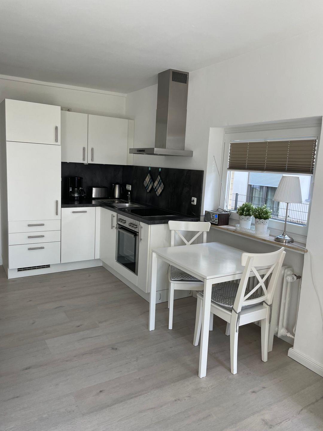 Das ca. 33 m² 1-Zimmer-Appartement befindet sich im Erdgeschoss. Die große Sonnenterrasse bietet viel Platz und ist ruhig, da zur geschützten Gartenseite gelegen. Der kombinierte Wohn-Schlafraum ist mit hochwertigem Vinyl ausgelegt. Die offene Einbauküche ist mit Ceran- Kochfeld, Geschirrspüler, Backofen und einer Kühl- Gefrierkombi ausgestattet. Das große Doppelbett (1,80 x 2,00 m/Einzelmatratzen) hat verstellbare Lattenroste und es gibt 2 Nachttische. Des Weiteren gibt es 2 bequeme Ledersessel, ein Flach-TV, Kleiderschrank und Garderobe. Das sehr moderne Badezimmer verfügt über ein Fenster, die große Dusche ist bequem und fast barrierefrei. Waschmaschine und Trockner sind im Haus gegen Gebühr nutzbar.