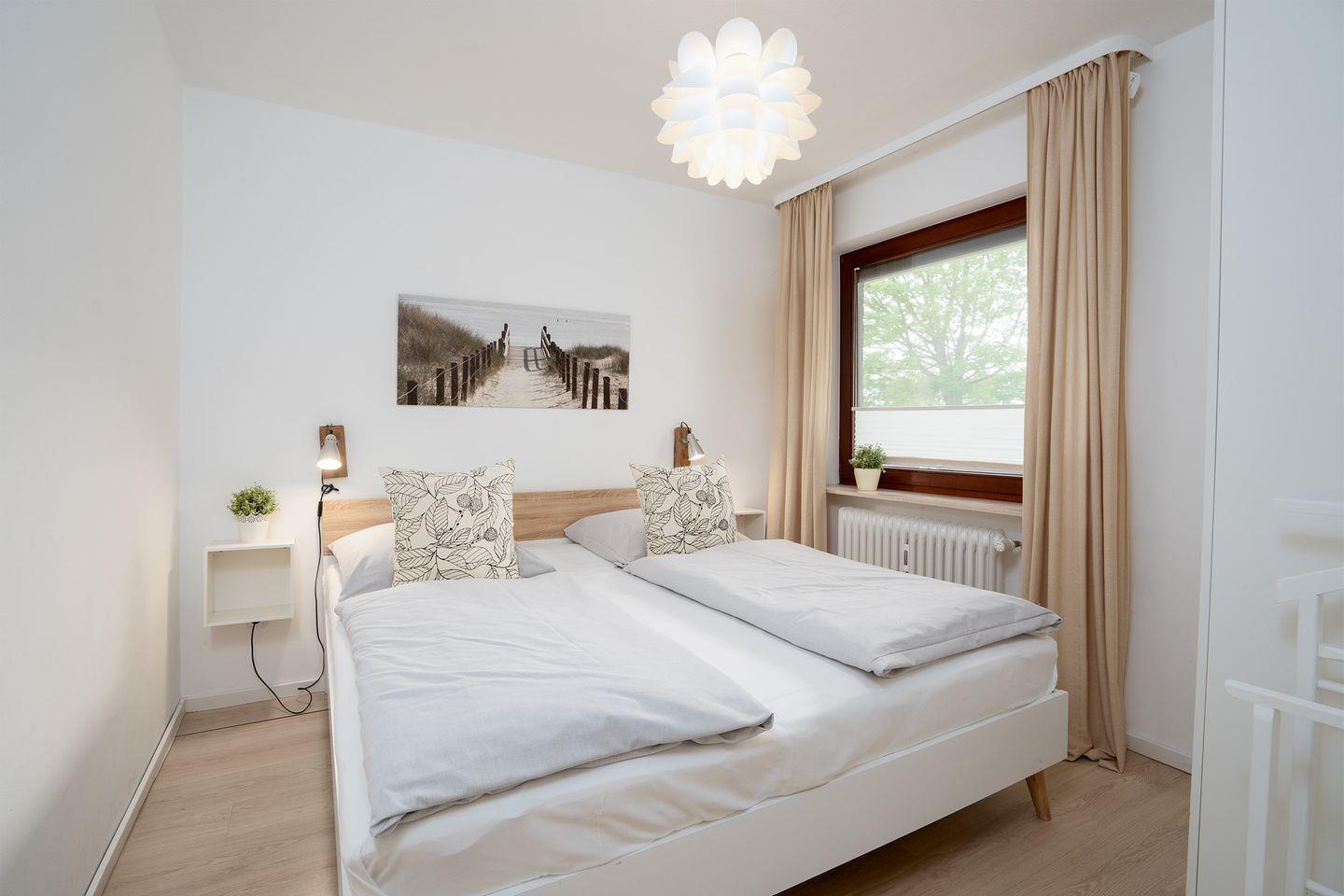 Das separate Schlafzimmer verfügt über ein großes Doppelbett (2x Matratzen 90x200) und einen geräumigen Schrank. Durch die zusätzliche Schlafmöglichkeit im Wohnzimmer (140x200) ist das Appartement somit sowohl für Paare als auch für Familien (bis zu 4 Personen) ideal. Sowohl Schlaf- als auch Wohnzimmer verfügen über Rollläden (im Wohnzimmer elektronisch).