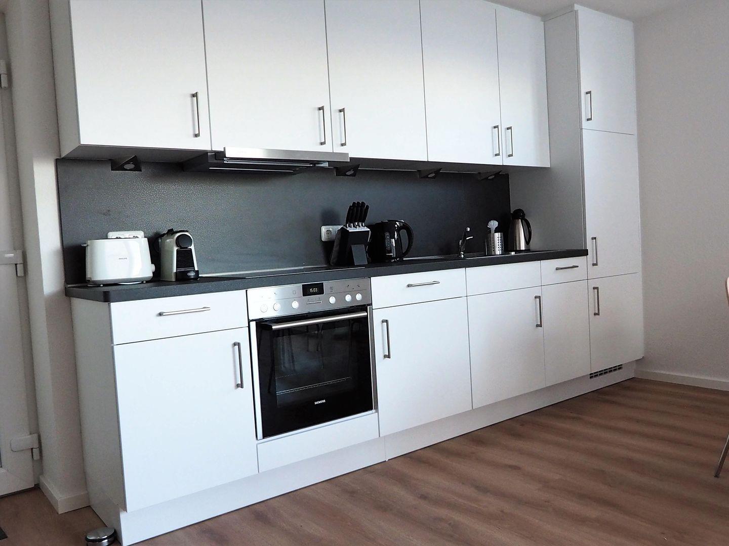 Hochwertige Küche mit Geschirrspüler, Herd und Backofen.