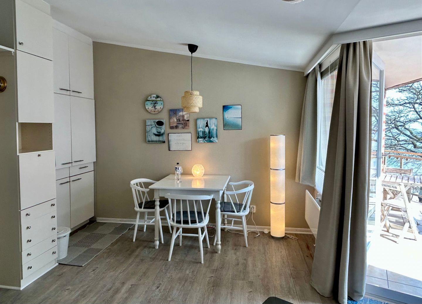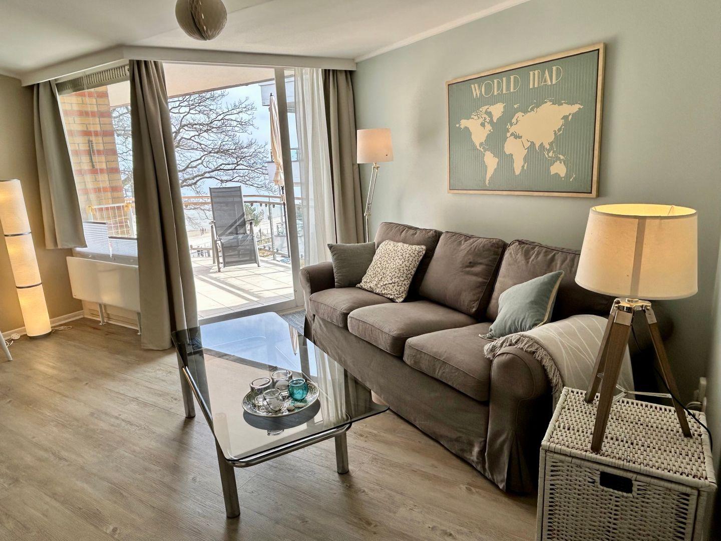 Das Appartement Meerblick befindet sich in direkter Strandlage in der 3. Etage der App.-Anlage Montemare. Vom Balkon aus genießen Sie den herrlichen Blick auf die Ostsee und den Strand, die Sonne verwöhnt Sie hier von morgens bis zum späten Nachmittag. Der Bäcker befindet sich gleich um die Ecke, sowie die Fußgängerzone mit einer Vielzahl an attraktiver Gastronomie. Das Appartement verfügt über ein teilrenoviertes Vollbad, einen getrennten Schlafbereich (im Flur) mit Doppelbett bestückt mit einer Einzelmatratze. Desweiteren einen hellen Wohn-/Essbereich mit Essplatz und 4 Stühle. Eine gemütliche Sitzecke bestehend aus Schlafcouch (160x200cm/Einzelmatratze), Sessel und Tisch. Die Küche ist mit einem Herd, Kühlschrank, Kaffeemaschine, Toaster und Wasserkocher ausgestattet. Genießen Sie den seitlichen Blick auf das Meer und das Strandleben vom Balkon.