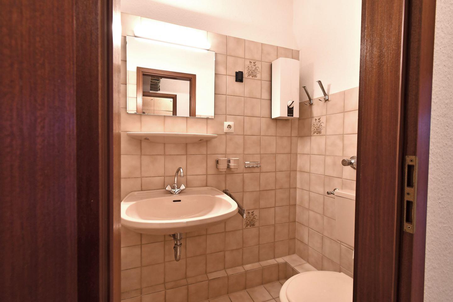 Das Bad verfügt über eine Dusche, Waschtisch und WC.