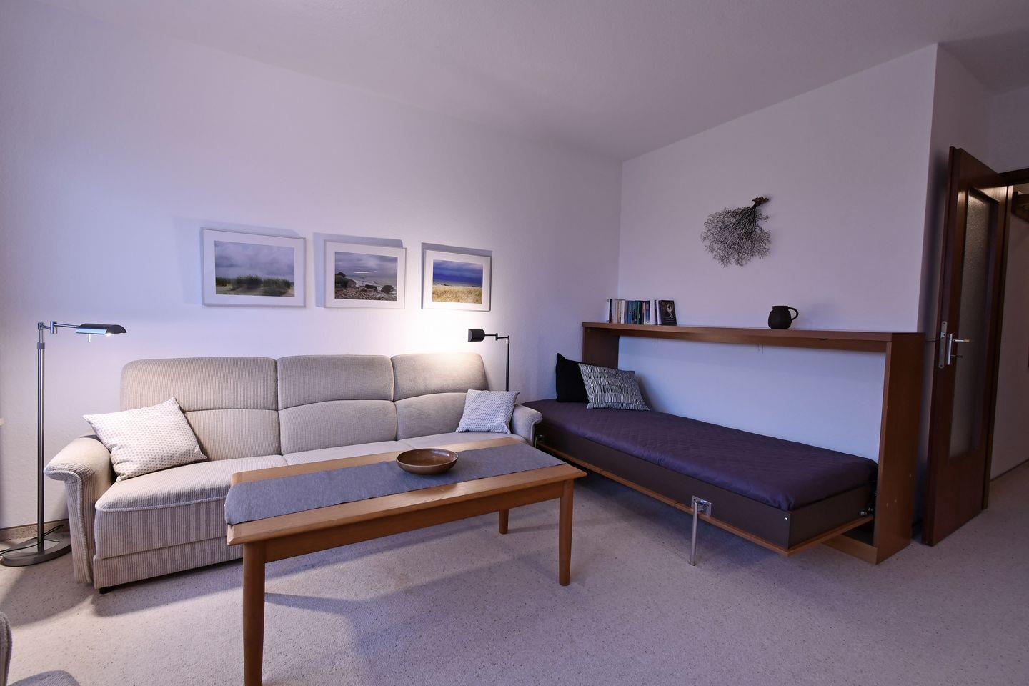 Der kombinierte Wohn-Schlafraum ist mit einer hellen Polstergarnitur nebst zwei Sesseln, Couchtisch, Schrankbett für eine Person und Flachbild-TV ausgestattet.