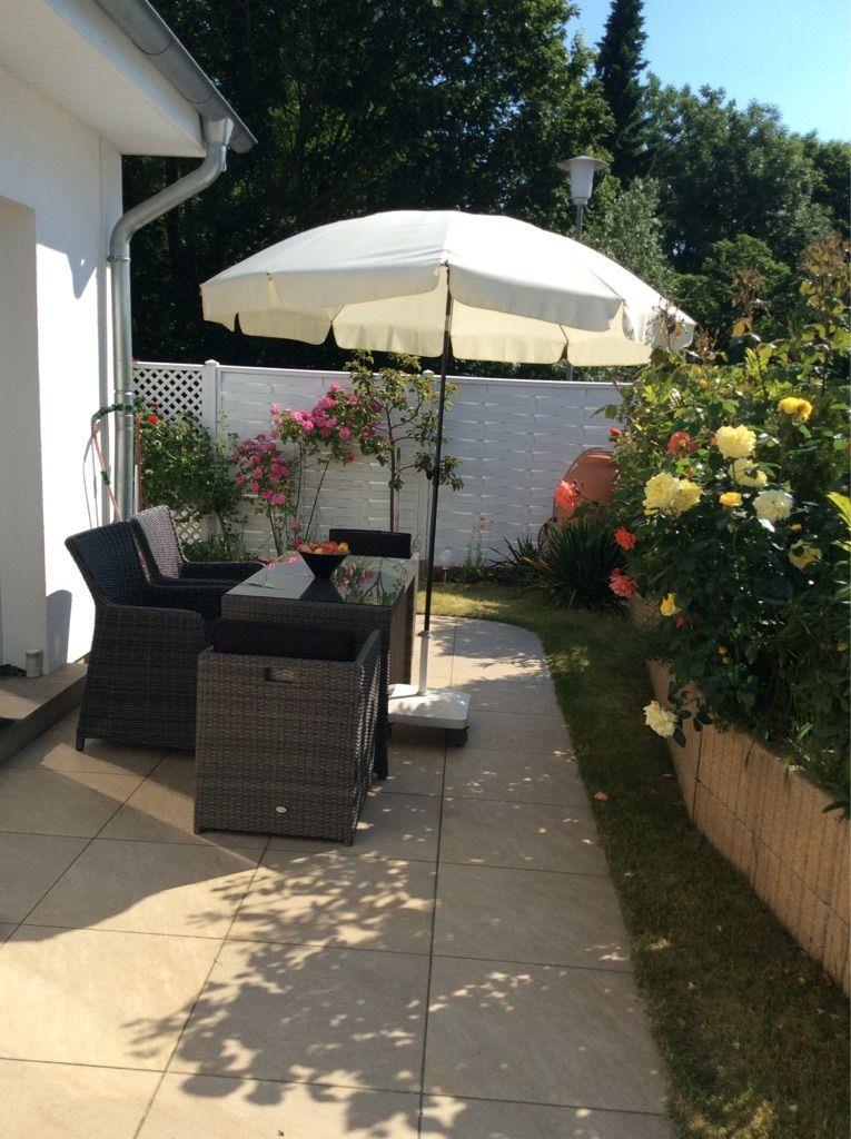 Vom Wohnzimmer gelangen Sie auf die großzügige Sonnenterrasse mit dem kleinen Garten, wo Sie herrlich entspannen und die Ruhe der Umgebung genießen können.