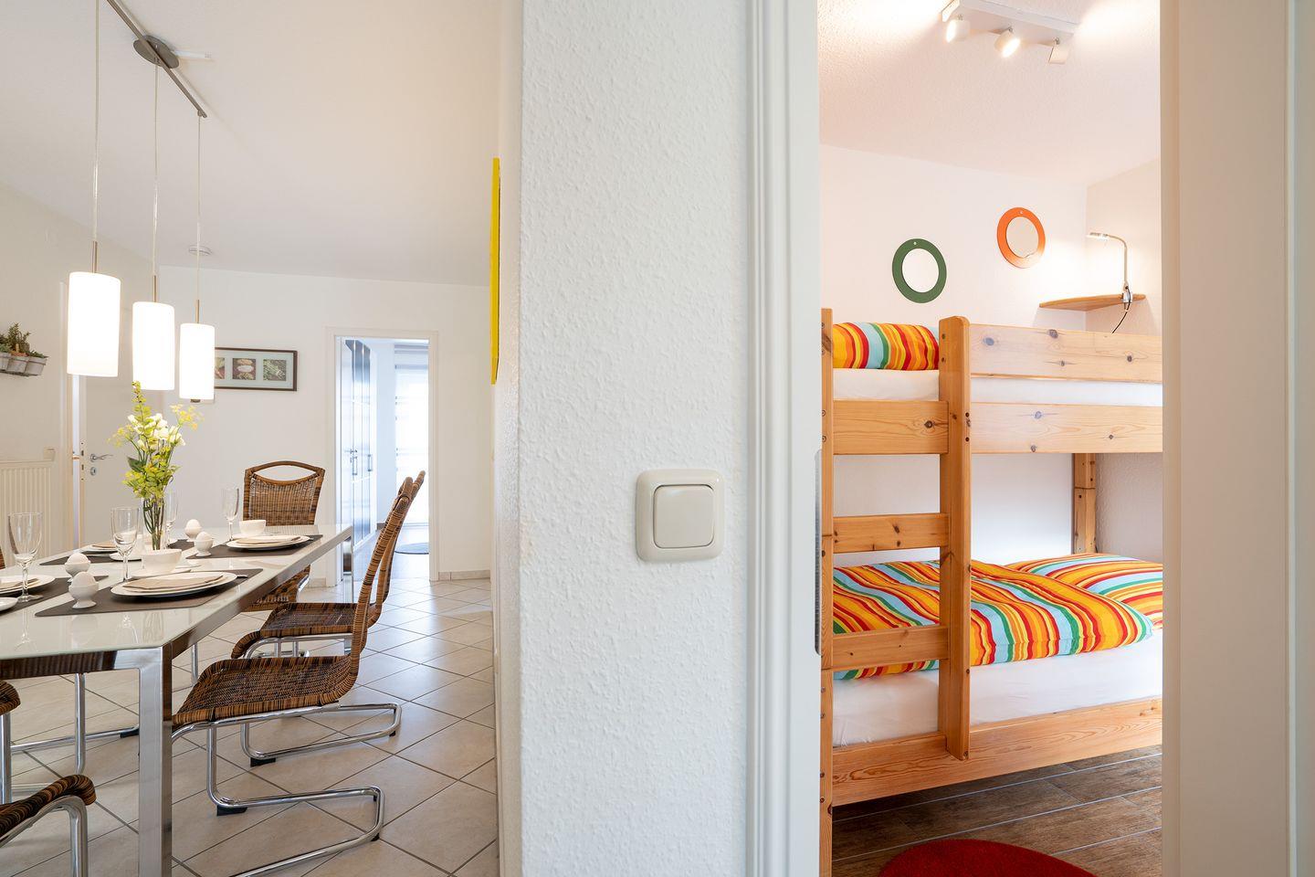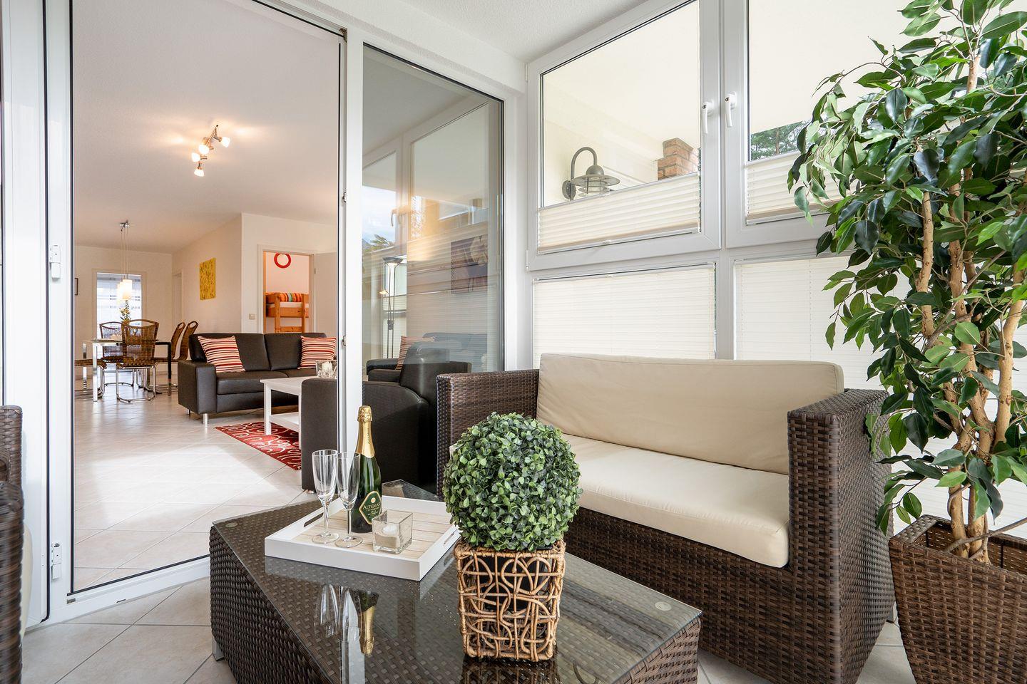 Hier finden Sie auf 80 qm Urlaubskomfort für die ganze Familie. Die sehr schöne 4-Raum-Ferienwohnung Nr. 3 befindet sich im Erdgeschoss und hat eine Terrasse, sowie einen Wintergarten. Die voll ausgestattete Küche ist in den Wohn- und Essbereich integriert. Die Wohnung hat drei Schlafräume: Im 1. steht ein Doppelbett, im 2. ein Etagenbett, und der 3. verfügt über ein Einzelbett. Das moderne Bad hat eine Dusche. WLAN inklusive. Der Strand und die Promenade sind weniger als 5 Gehmin. entfernt.