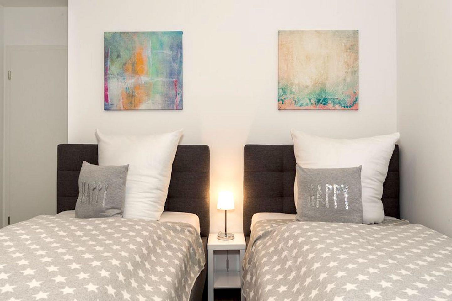 Nach einem tollen Tag am Strand können Sie sich in den zwei Schlafzimmern auf die hochwertigen und komfortablen Matratzen mit Geltex Technologie freuen. Das eine Schlafzimmer verfügt über ein Doppelbett (180x200) und das andere über zwei Einzelbetten (100x200), die auch nach Bedarf zusammengestellt werden können. Beide Schlafzimmer haben jeweils ein LCD Samsung Smart TV und es befinden sich entsprechende Verdunkelungsrollos vor den Fenstern, so dass einem erholsamen Schlaf nichts im Wege steht. Ein Baby Reisebett ist ebenfalls vorhanden, so dass auch die Kleinsten einen erholsamen Schlaf genießen können.