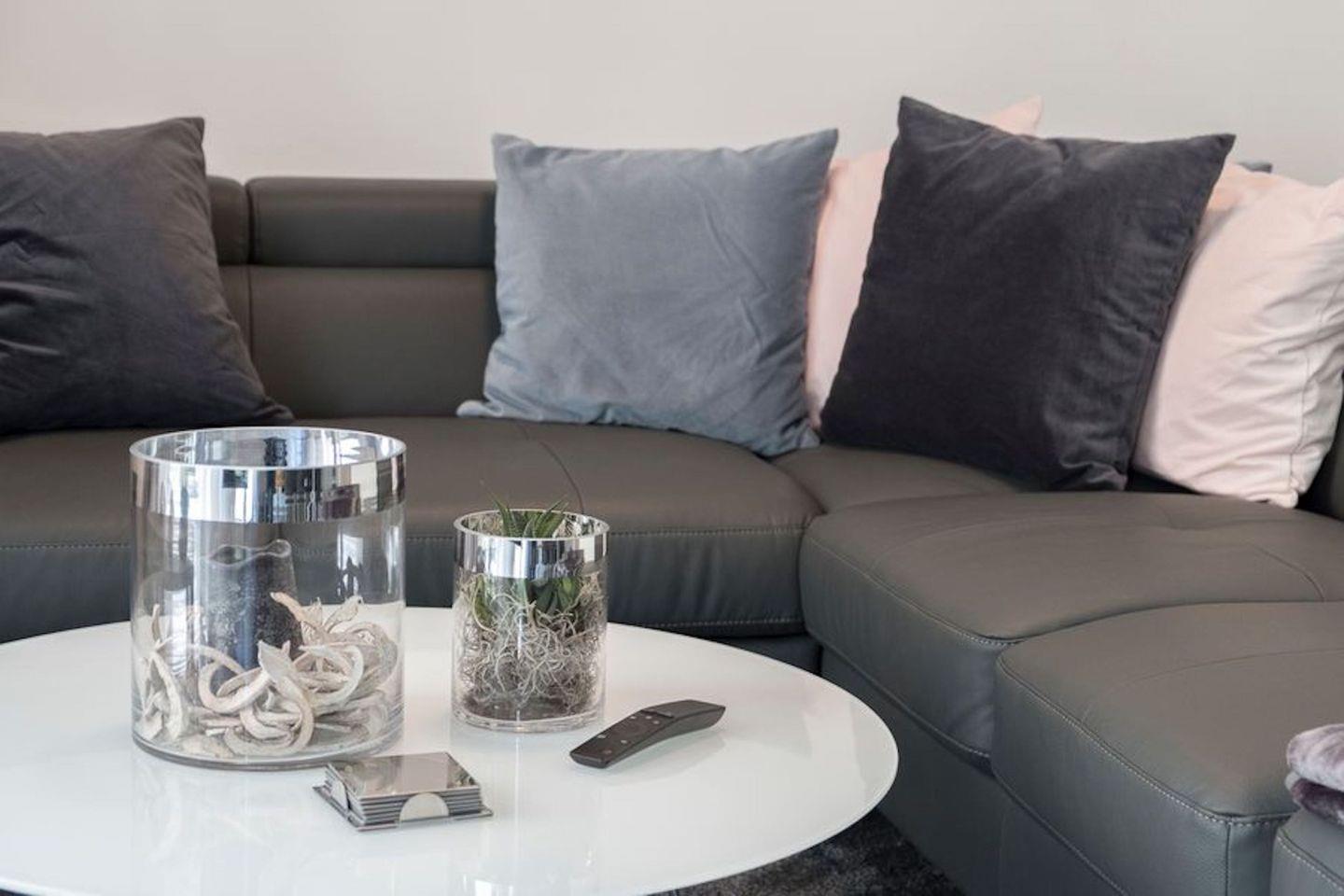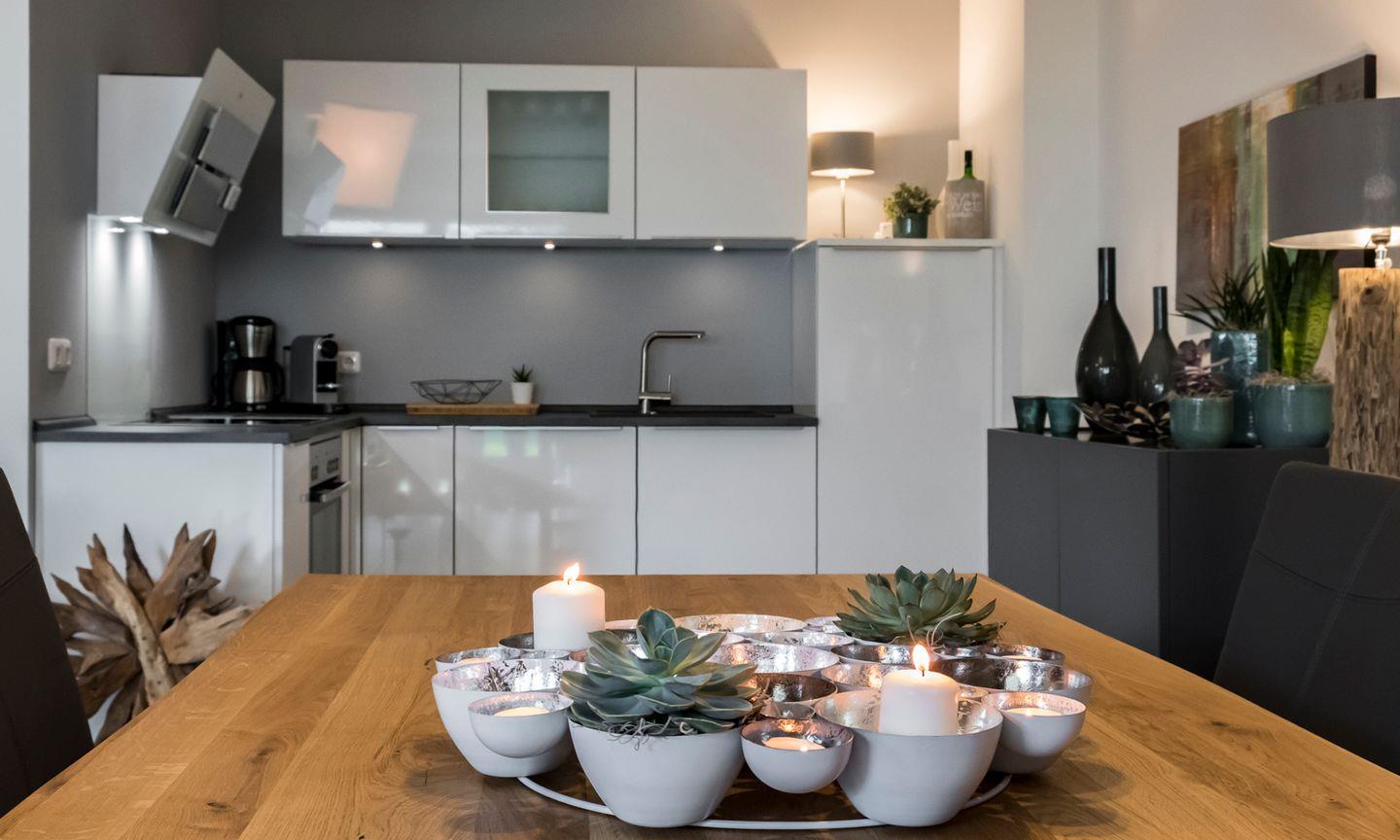 Der große und helle Wohnbereich, mit gemütlicher Wohnlandschaft lädt zu entspannten Fernsehabenden mit unserem großen LCD Samsung Smart TV oder gemütlichen Abenden mit der gesamten Familie ein. Die moderne Nolte Küche ist offen gestaltet und in den Wohn- und Essbereich integriert und lässt für alle Hobbyköche keine Wünsche offen. Der große Kühlschrank hat reichlich Platz und mit unseren hochwertigen Töpfen, Messern, Geschirr und Besteck lässt sich jeden Tag ein wunderbares Menü zaubern. Kinderbesteck und ein Hochstuhl gehören natürlich zur Ausstattung, damit es auch den Kleinsten an nichts fehlt. Mit der Nespresso Maschine können Sie sich täglich eine Kaffeespezialität nach Ihren Wünschen zubereiten.