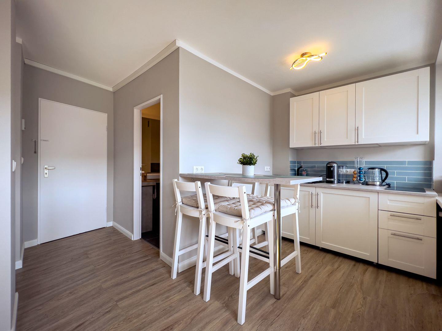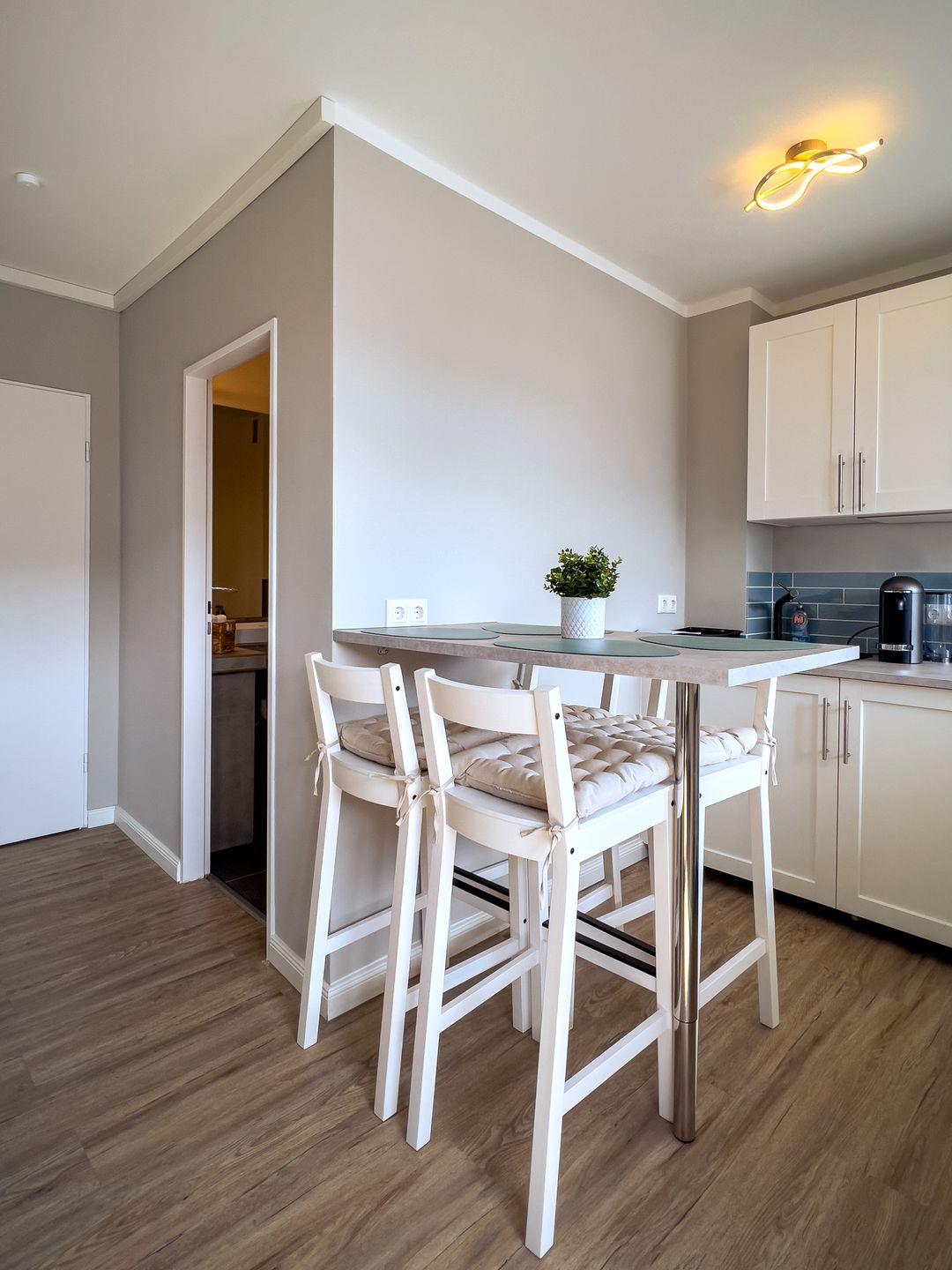 Der Fußboden ist mit hellem Laminatboden ausgelegt, ein erhöhter Esstisch mit 4 Stühlen trennt die offene, moderne Küche. Sie ist u.a. mit einer klassischen Kaffeemaschine ausgestattet (Espressomaschine nicht vorhanden). Das Cerankochfeld hat 2 Platten.