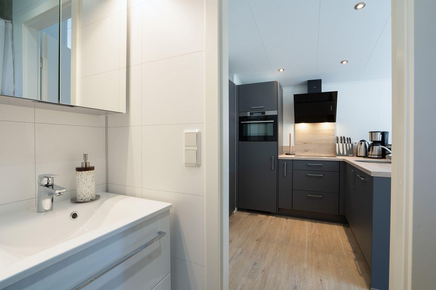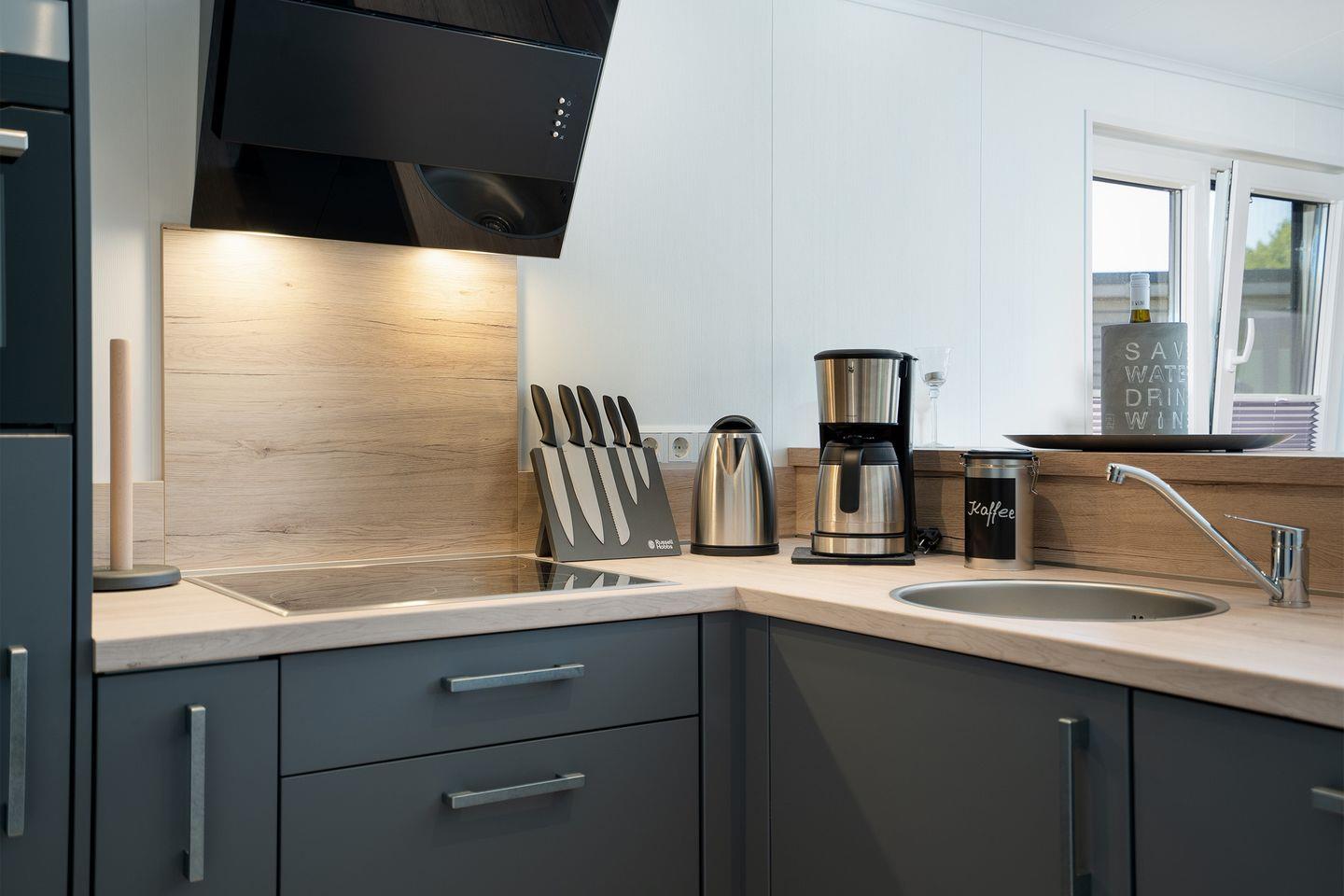 Die offene moderne Küche verfügt neben einer Kaffeemaschine, Wasserkocher und Toaster über ein 4-flammiges Ceran-Kochfeld, einen Mikrowellenkompaktbackofen, Kühlschrank mit Gefrierfach und einem Geschirrspüler.
