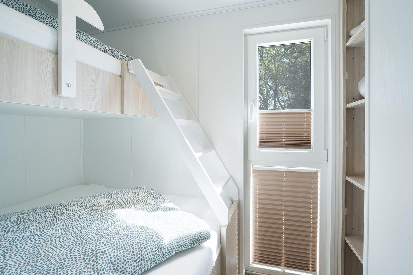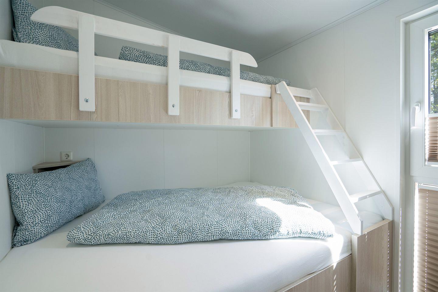 Das zweite Schlafzimmer hat ein „Erlebnisetagenbett“ (140/200 und 80/200) mit Absturzsicherung und Leiter. Auch Kinder werden von diesem Raum begeistert sein.