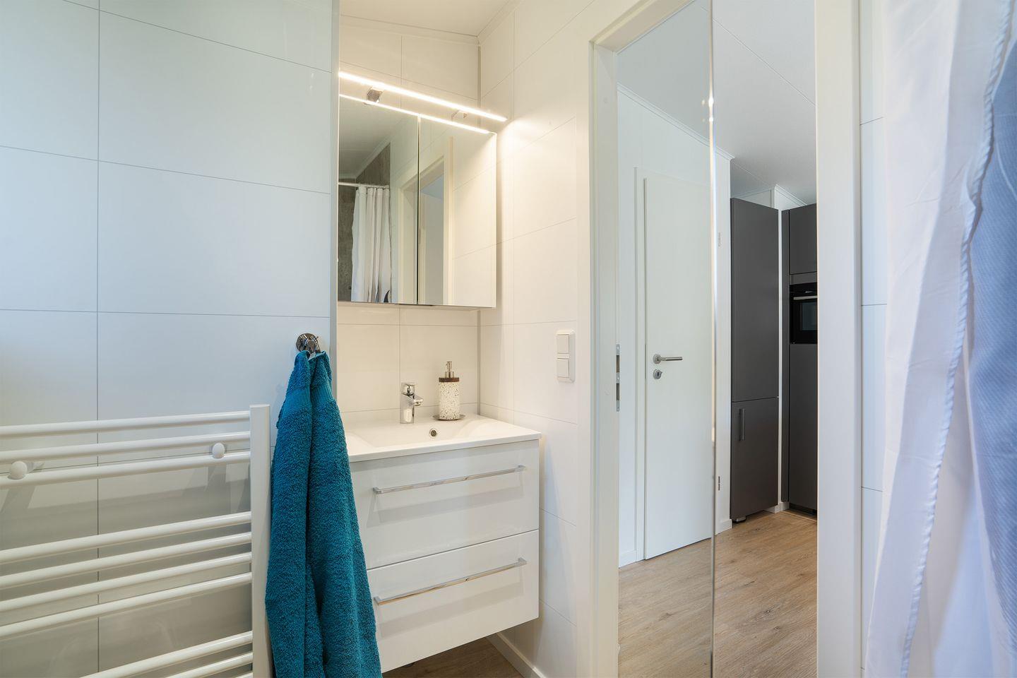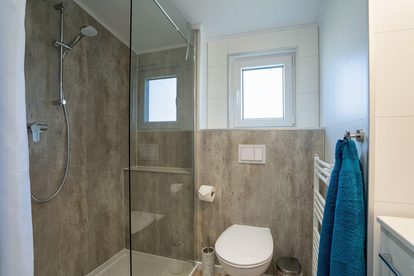 Im Badezimmer findet Ihr neben WC, Waschtisch und Spiegelschrank eine ebenerdige Dusche (80/140) mit Glastür. Genügend Ablagefläche und ein Fön sind ebenfalls vorhanden.