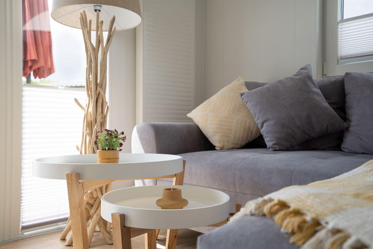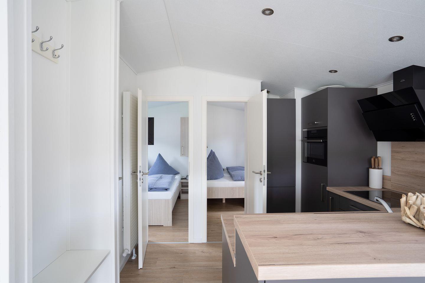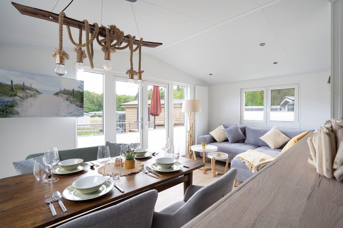 Die „Zweite Heimat“ ist hochwertig eingerichtet und verfügt neben zwei gemütlichen Schlafräumen, über einen lichtdurchfluteten Wohnraum mit Panoramaglasfront und Zugang zur großen Sonnenterasse. Der helle Wohnbereich bietet ein bequemes Sofa und einen gemütlichen Essbereich.