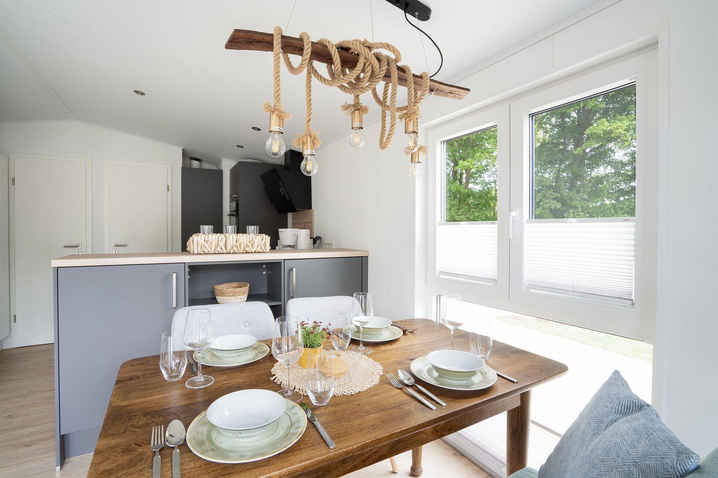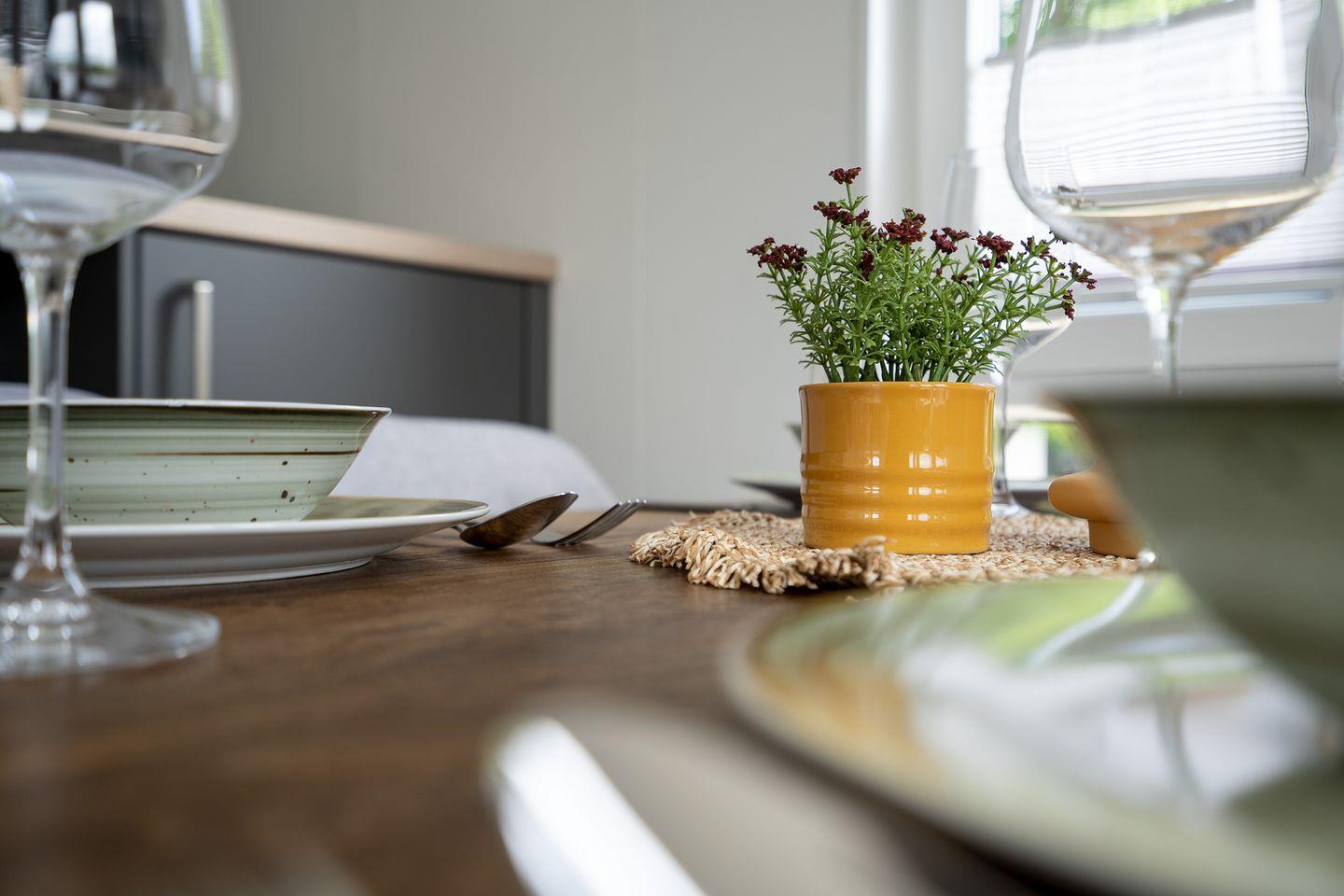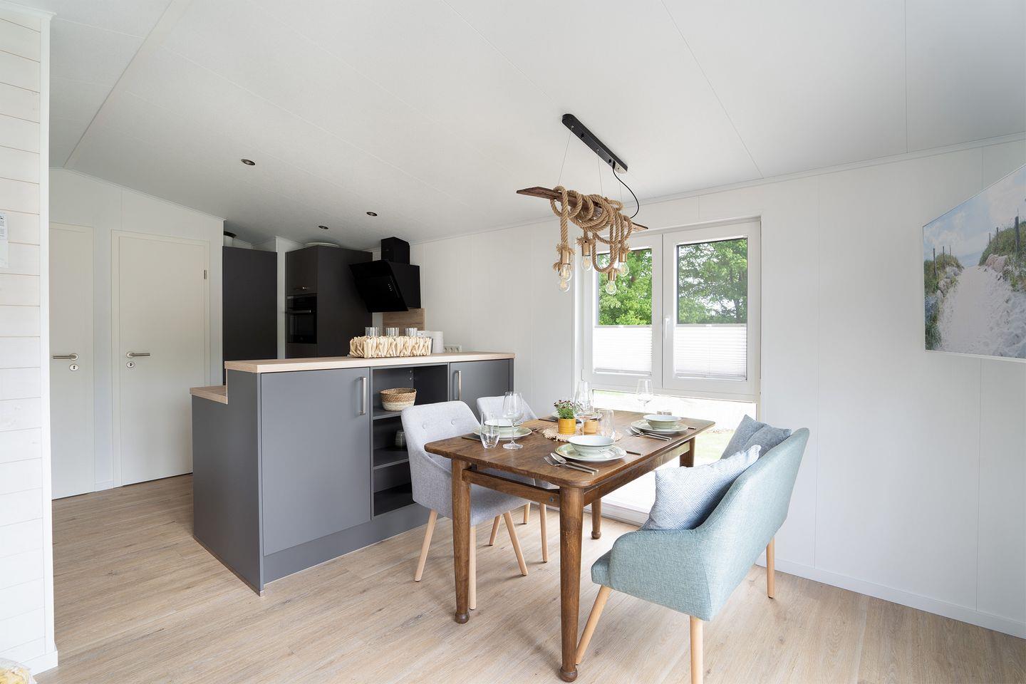 Die „Zweite Heimat“ ist hochwertig eingerichtet und verfügt neben zwei gemütlichen Schlafräumen, über einen lichtdurchfluteten Wohnraum mit Panoramaglasfront und Zugang zur großen Sonnenterasse. Der helle Wohnbereich bietet ein bequemes Sofa und einen gemütlichen Essbereich.