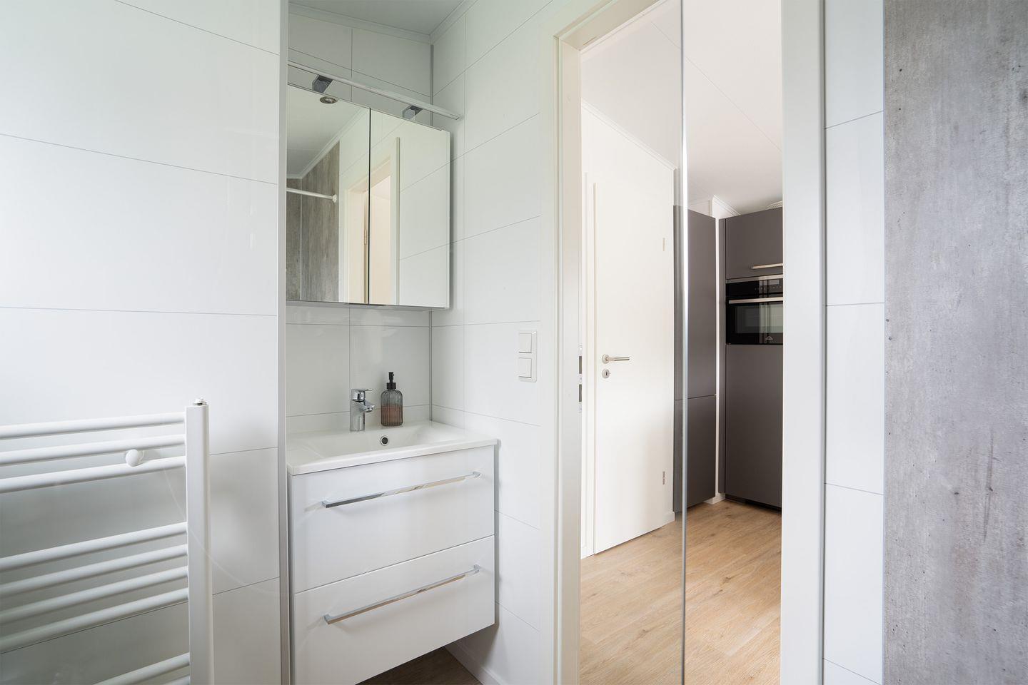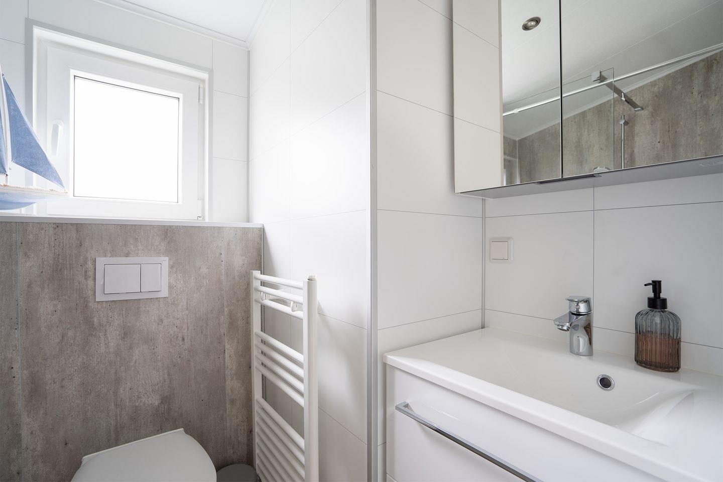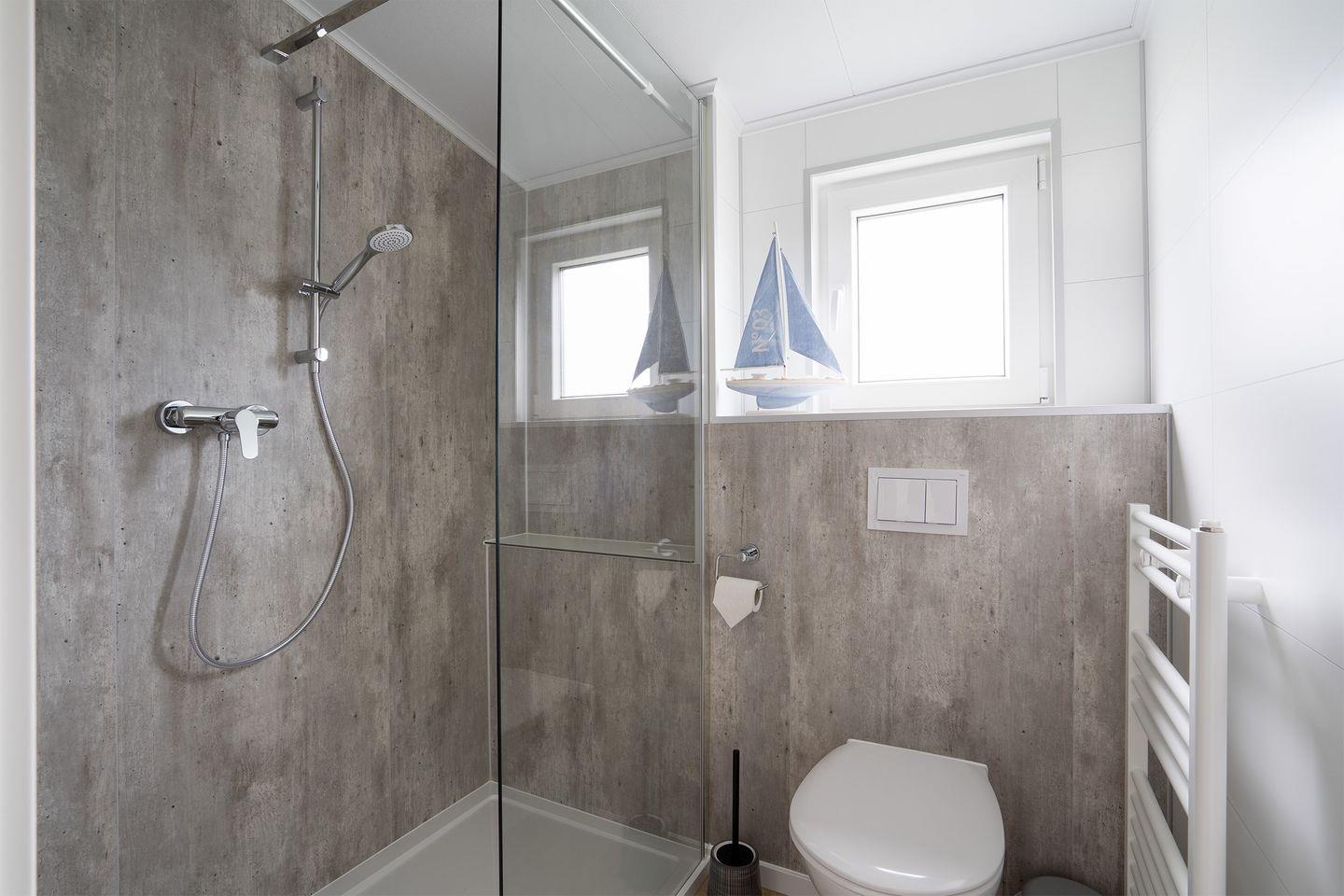 Ein Badezimmer mit großer, ebenerdiger Dusche runden die Bedürfnisse des Alltags ab.