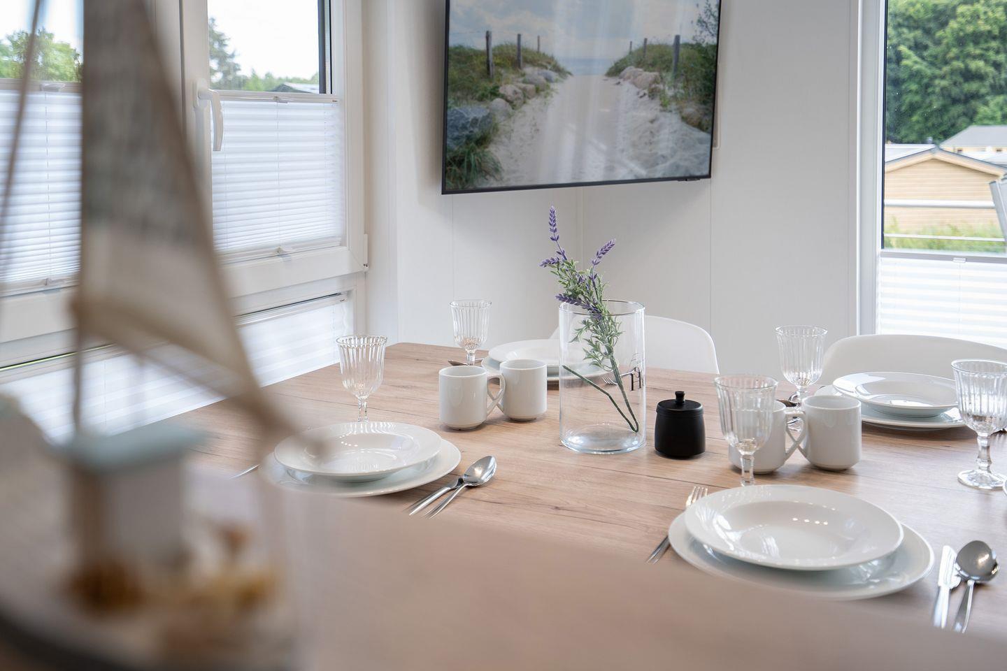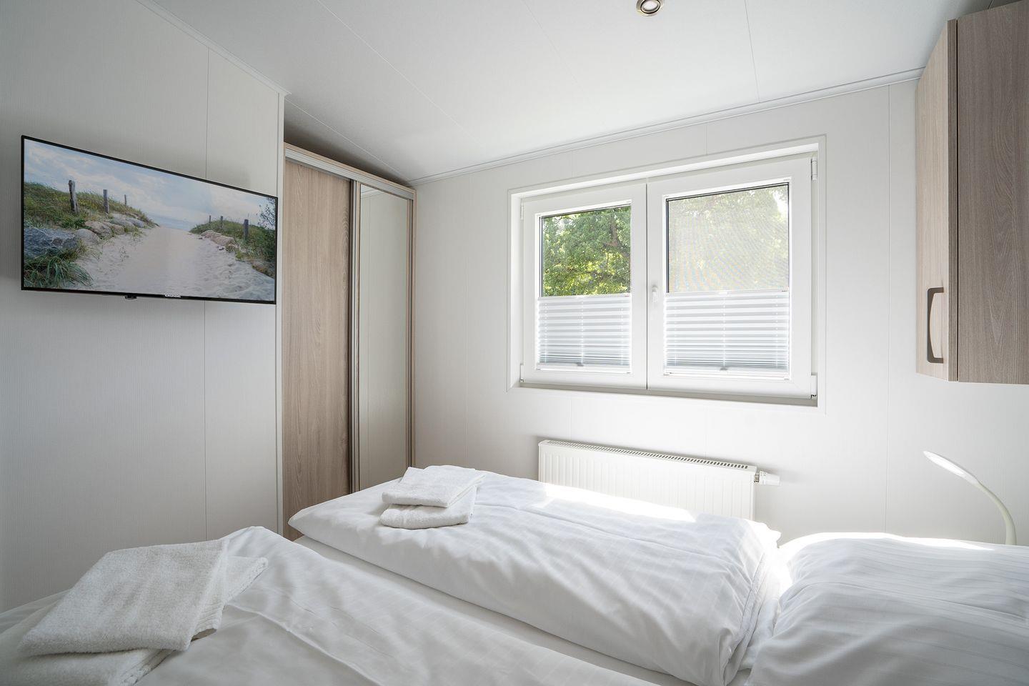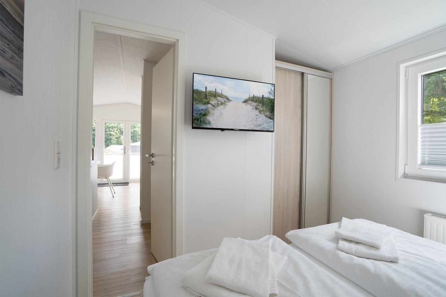 Sowohl im Wohn- und Essbereich als auch im Hauptschlafzimmer befindet sich ein Flachbild-TV. Das Ferienhaus bietet ein Hauptschlafzimmer mit Doppelbett (160x200cm, offenes Fußende), das zweite Schlafzimmer ein Etagenbett (Liegefläche oben 80x200cm, Liegefläche unten 140x200cm). Ein modernes Duschbad mit bodengleicher Dusche sorgt für morgendliche Erfrischung.