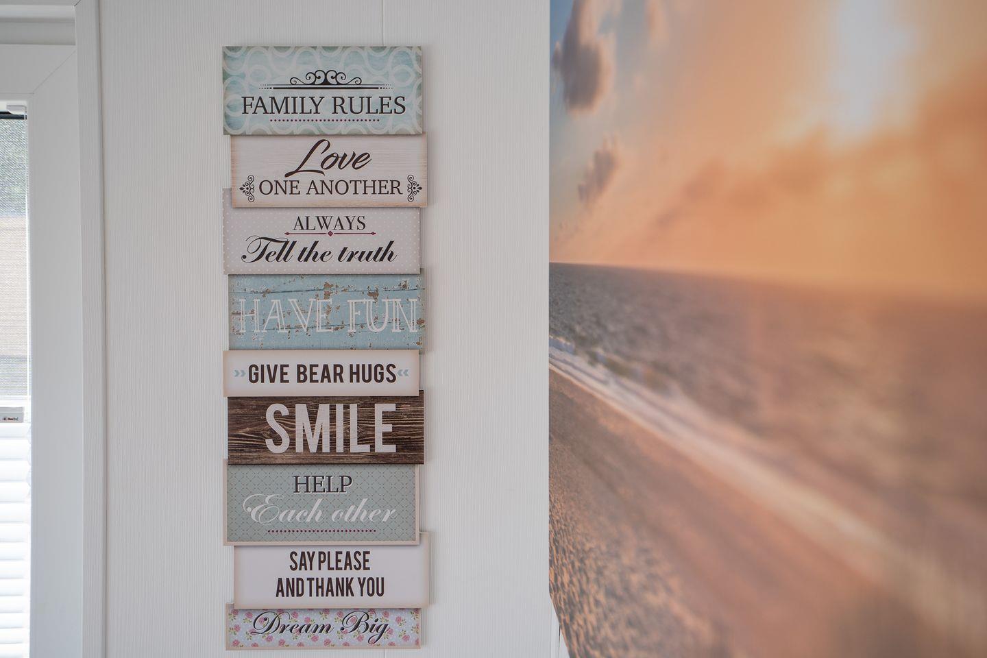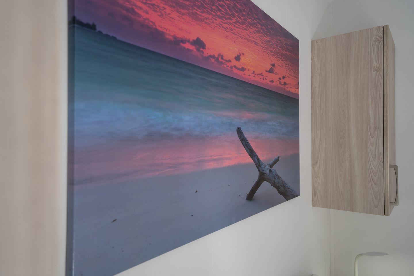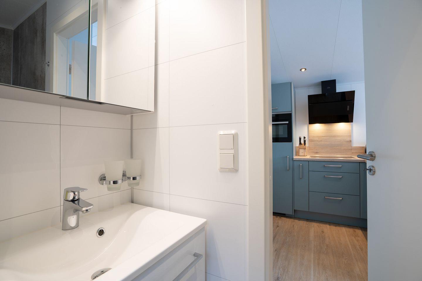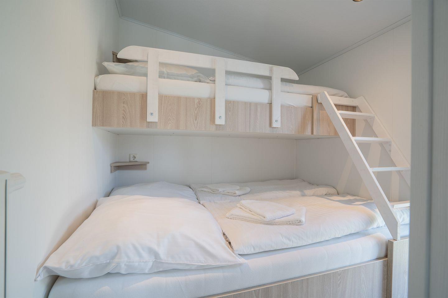 Sowohl im Wohn- und Essbereich als auch im Hauptschlafzimmer befindet sich ein Flachbild-TV. Das Ferienhaus bietet ein Hauptschlafzimmer mit Doppelbett (160x200cm, offenes Fußende), das zweite Schlafzimmer ein Etagenbett (Liegefläche oben 80x200cm, Liegefläche unten 140x200cm). Ein modernes Duschbad mit bodengleicher Dusche sorgt für morgendliche Erfrischung.