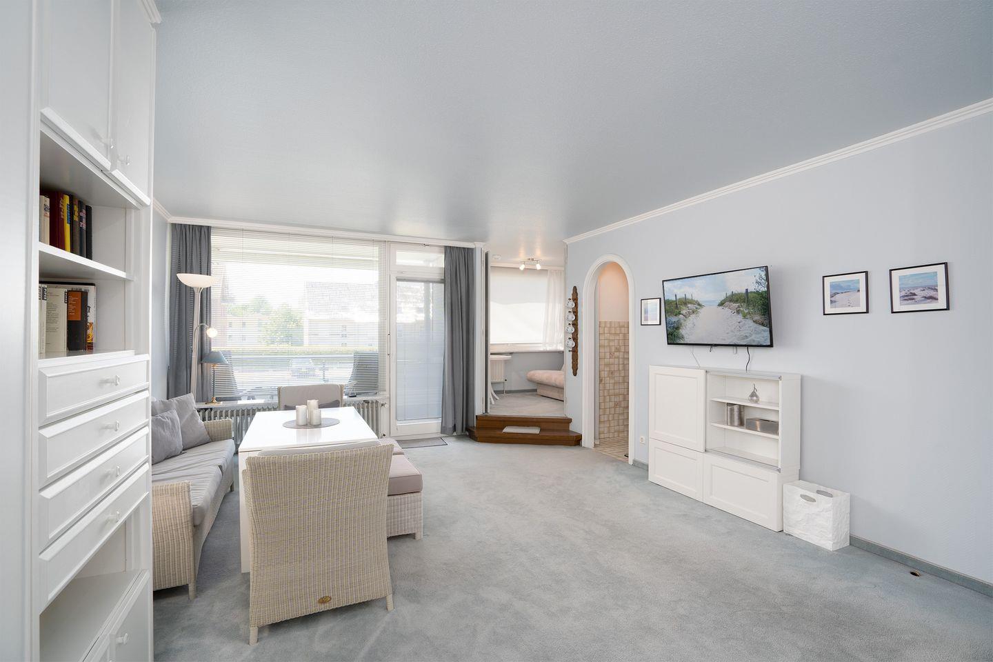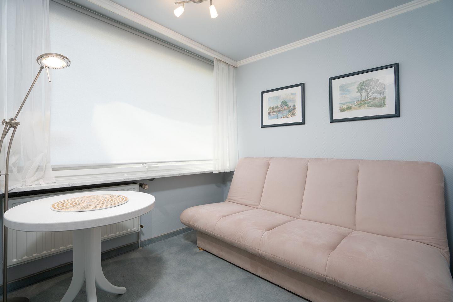 Das Schrankbett (2 m x 0,80 m x 2,00 m/Einzelmatratzen) im Wohnbereich ist für zwei Personen geeignet und kann bei Bedarf hochgeklappt werden. Darüber hinaus verfügt das Appartement über ein separates Zimmer, das mit einer Schlafcouch (1,20 m x 2m) ausgestattet ist.