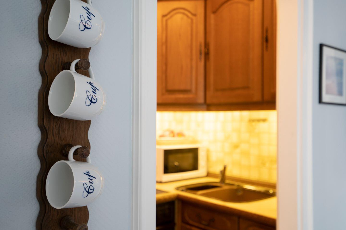 Die kleine Küche verfügt neben einer Kaffeemaschine, einem Wasserkocher, auch über eine Mikrowelle und einem Backofen.