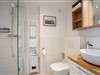 Das Badezimmer ist hell und mit einer bodengleichen Dusche mit zwei beweglichen Glaselementen zu nutzen. Im Bad befindet sich eine Fußbodenheizung und ein Handtuchheizkörper.