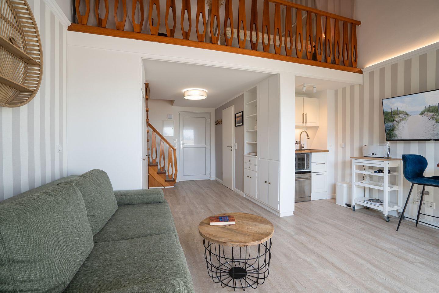 Der großzügige Wohnraum ist mit einer Schlafcouch, sowie einem Flatscreen Fernseher ausgestattet und bietet eine ebenso schöne Aussicht. Die Küche verfügt über eine gute Ausstattung (Filter-Kaffeemaschine und Wasserkocher etc.) mit Geschirrspüler, Mikrowelle (Heißluft mit Grillfunktion) und einem Induktionsherd. Der erhöhte Essbereich mit einem Esstisch und Stühlen schließt sich der Küche an.
