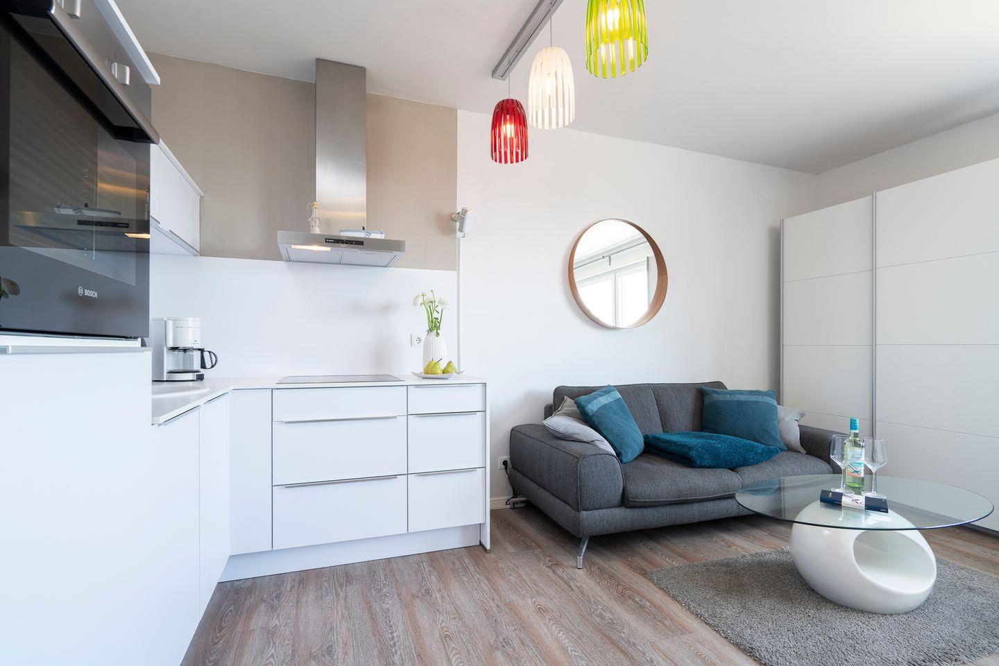 Entdeckt unsere charmante 30 qm große 1-Zimmer-Nichtraucher-Ferienwohnung im Capolino Suite, gelegen direkt an der Strandallee und somit in bester Lage zur Strandpromenade. Modern und hell eingerichtet, bietet diese Wohnung den idealen Rückzugsort für Paare oder Einzelreisende. Dank der zentralen Lage könnt ihr die direkte Nähe zum Strand genießen und habt das lebhafte Treiben der Scharbeutzer Promenade direkt vor der Tür. Das Gebäude verfügt über eine Tiefgarage mit Fahrradabstellraum, deren Nutzung je nach Verfügbarkeit möglich ist, und einen Fahrstuhl, der euch direkt in eure Etage bringt. In der Wohnung gibt es kostenfreies WLAN (bei Störungen kein Anspruch auf Erstattung oder Ersatz). Die Wohnung befindet sich in einer lebhaften Lage mit zwei Restaurants und einer Cocktail-Bar direkt im Haus – ideal für alle, die das Urlaubsflair nicht nur am Strand, sondern auch bei gutem Essen und einem Drink genießen möchten.