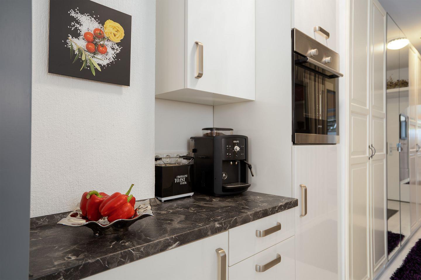 Eine komplett eingerichtete Pantryküche mit einer klassischen Kaffeemaschine lässt keine Wünsche offen.