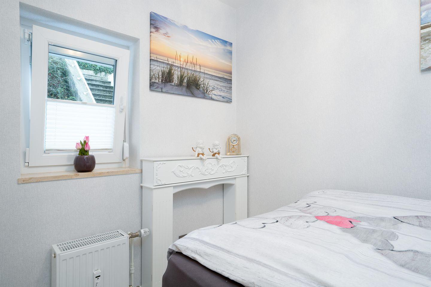 Im Schlafzimmer befindet sich ein gemütliches Boxspringbett 1,40 m x 2,00 m (Topper). Rollläden sind im Schlafzimmer vorhanden. Das maritime Badezimmer verfügt über eine großzügige Dusche und einem Waschtisch mit WC.