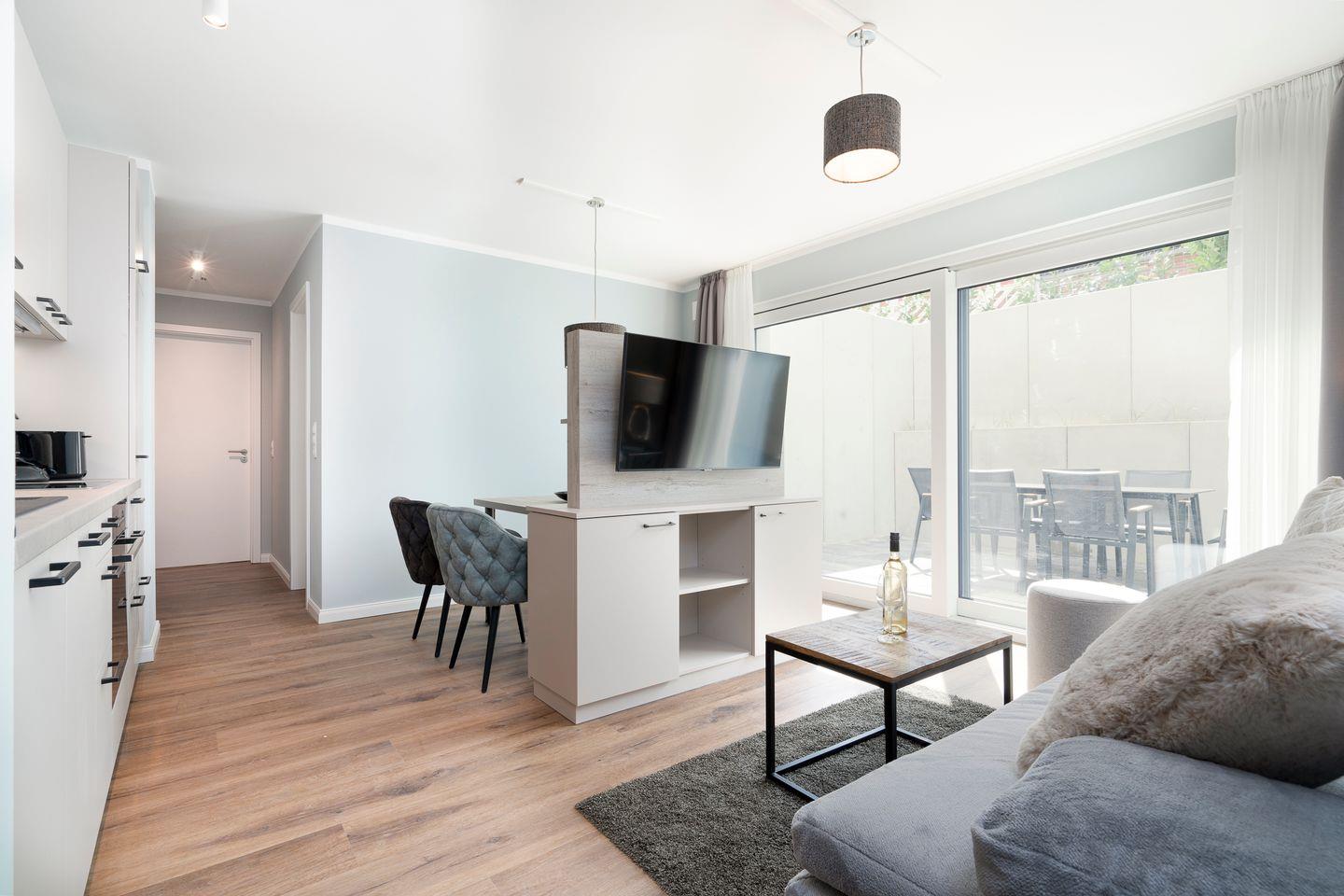 Entdeckt das geräumige, 60 qm große Nichtraucher-Appartement „Lounge 1“ im Untergeschoss des Hauses „Sturmfrei“. Diese besondere Ferienwohnung ist mit Farben gestaltet, die an den weiten Himmel, sanfte Dünen, feinen Sand und das endlose Meer erinnern. Eine großzügige Fensterfront bringt Licht in euren Wohnraum und ermöglicht den Zugang zur sonnenverwöhnten Terrasse in Südlage. Ergänzt wird das Raumangebot durch ein geräumiges Duschbad mit Oberlicht und eine praktische Abstellkammer für zusätzlichen Stauraum. Ein ideales Urlaubszuhause für Gäste, die Wert auf Privatsphäre und Komfort legen. In der Wohnung gibt es kostenfreies WLAN (bei Störungen kein Anspruch auf Erstattung oder Ersatz).