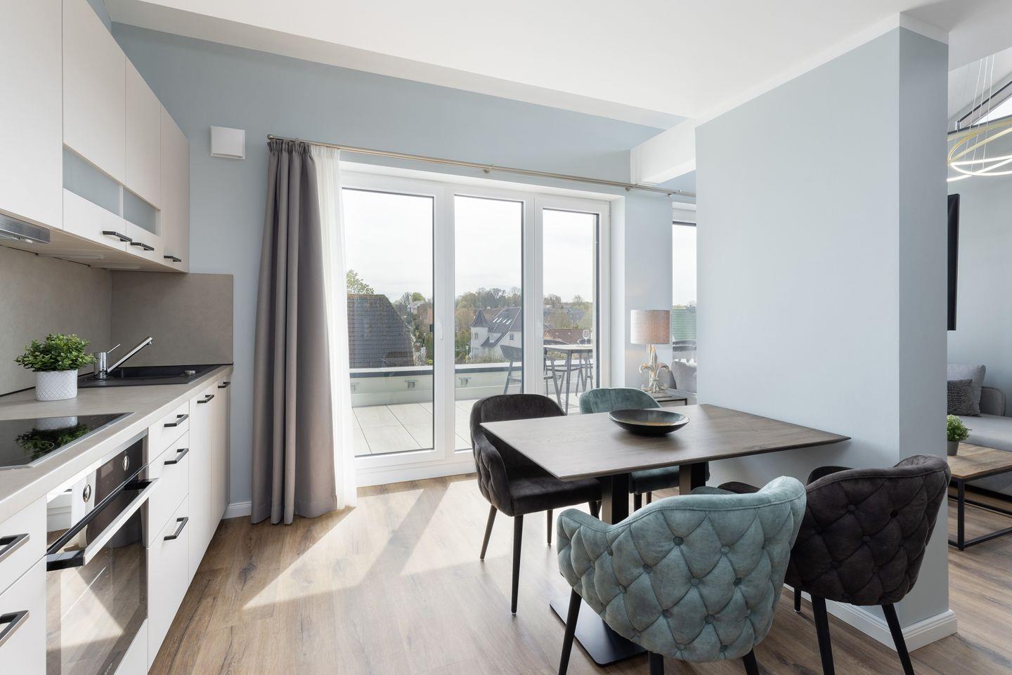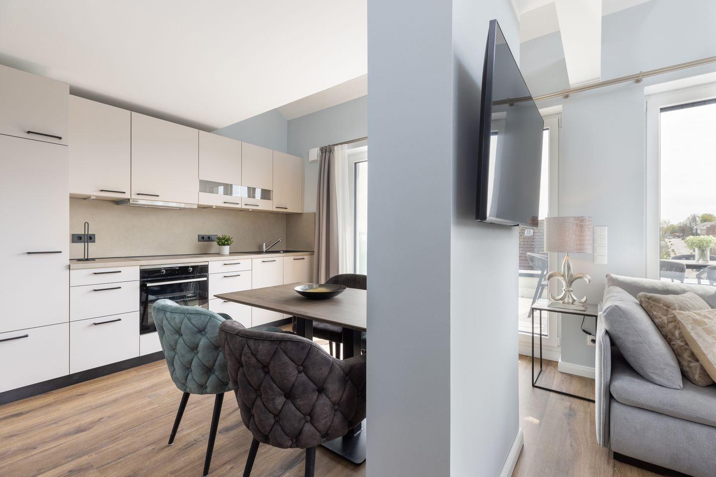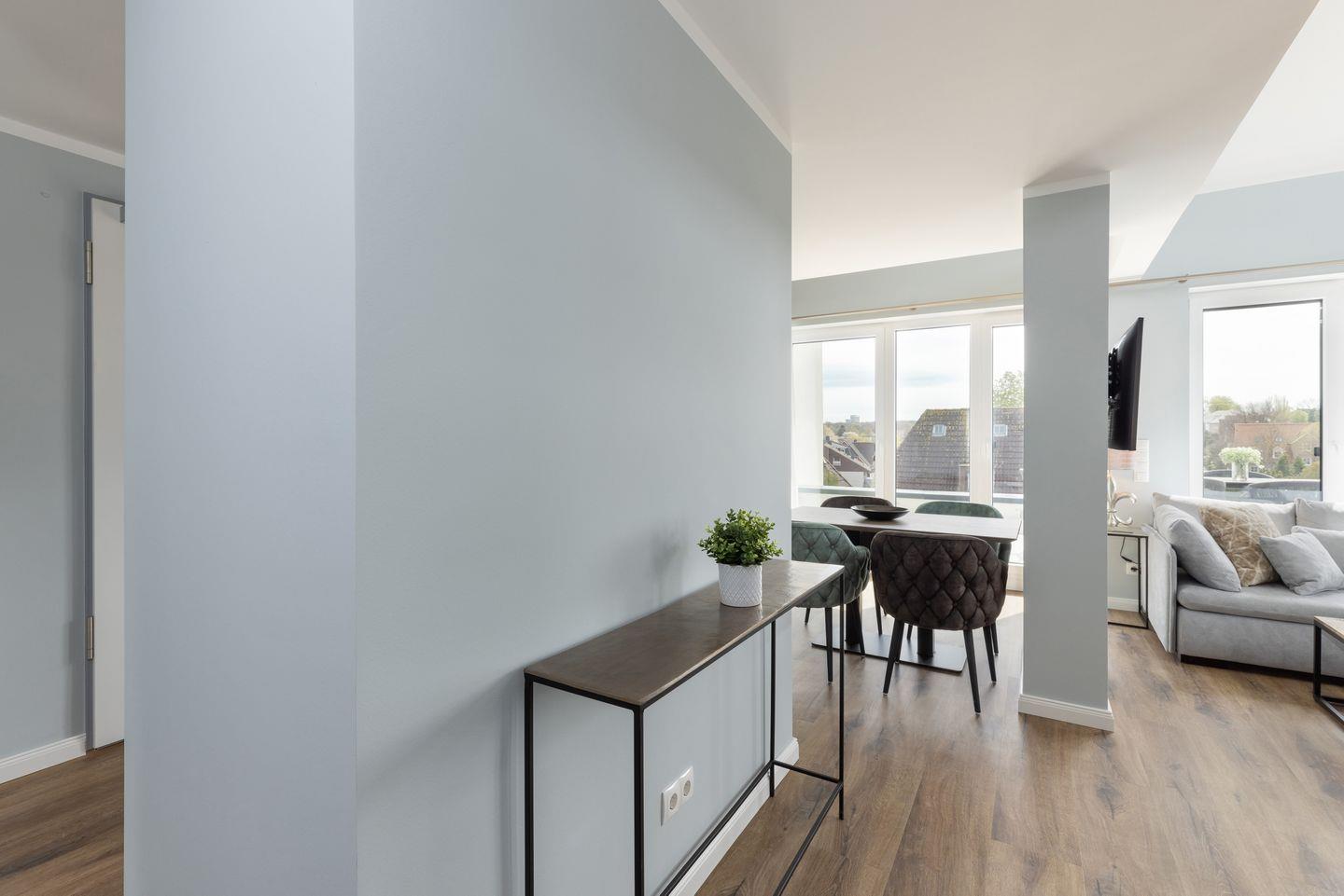 Willkommen in der "Galerie 3", einer Nichtraucher-Dachgeschoss-Wohnung im Appartementhaus "Sturmfrei", die sich im 2. Stock befindet. Diese etwa 75 qm große Ferienwohnung ist mit Farben und Materialien gestaltet, die euch das Gefühl von Himmel, Sand, Treibgut und Meer nahebringen. Der Eingangsbereich mit praktischem Stauraum für eure Garderobe im Wandschrank führt euch zu den gemütlichen Räumen dieser einzigartigen Galeriewohnung. Eine großzügige Fensterfront nicht nur erleuchtet euer Urlaubszuhause, sondern bietet auch Zugang zur Dachterrasse in Südlage, ausgestattet mit einem großen Tisch für sechs Personen, ideal für sonnenverwöhnte Stunden. Falls ihr eine Auszeit von der Außenwelt sucht, bietet das obere offene Galeriezimmer mit einem Boxspringsofa inkl. Schlaffunktion (230 x 120 cm) den perfekten Rückzugsort zum Lesen, Musik hören oder Tagträumen. In der Wohnung gibt es kostenfreies WLAN (bei Störungen kein Anspruch auf Erstattung oder Ersatz).