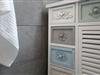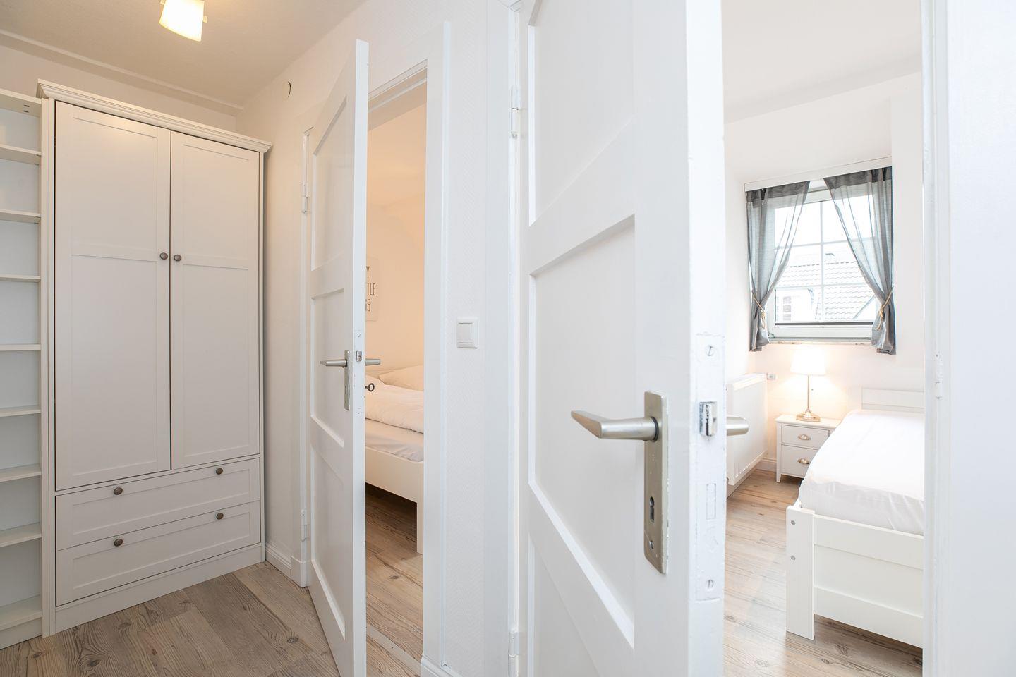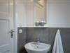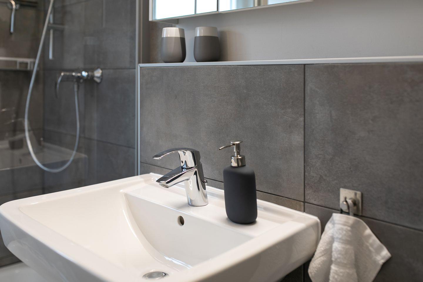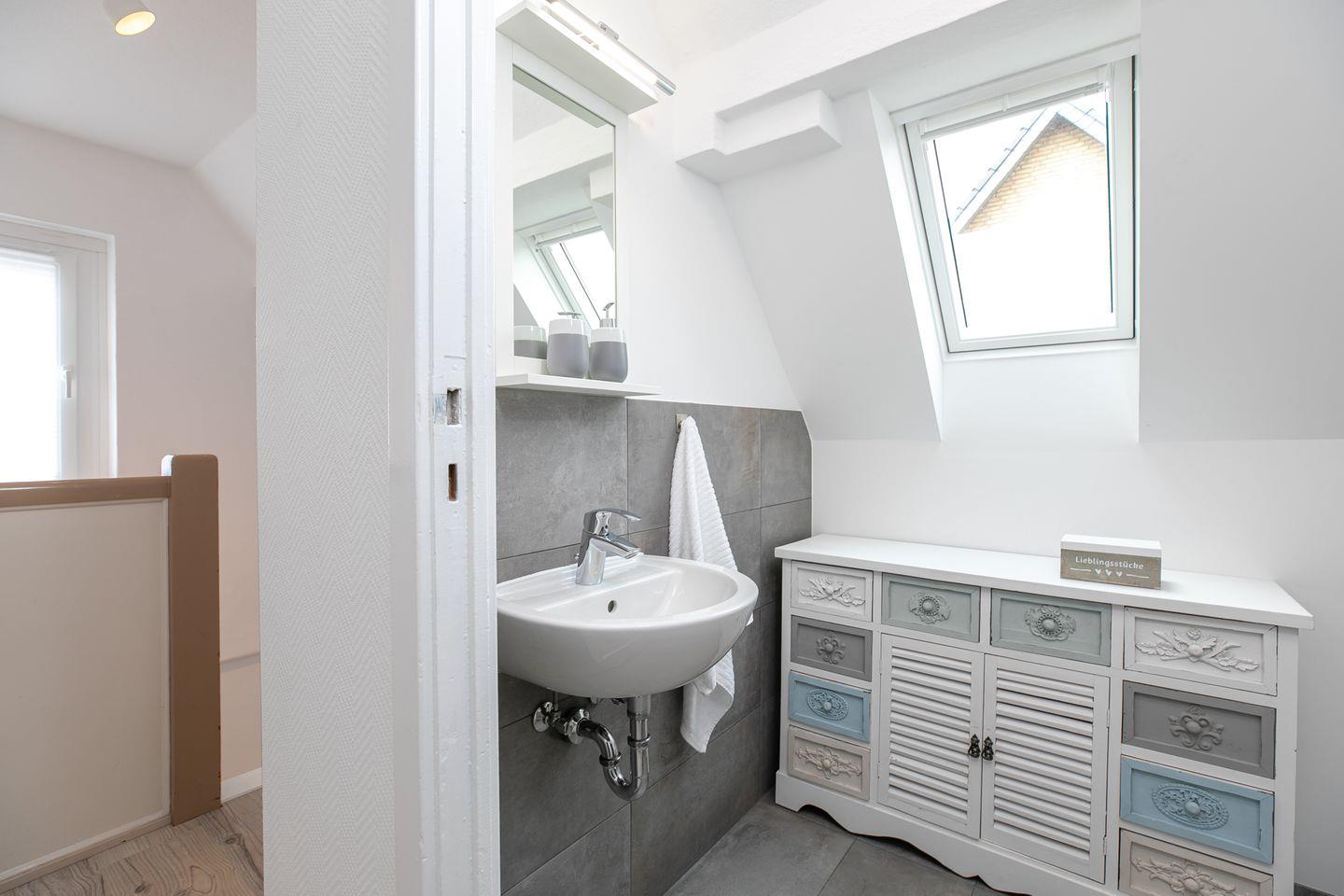 Auf der ersten Etage befinden sich zwei separate Schlafzimmer, jeweils mit gemütlichen Doppelbetten (je 2x 90x200 cm), perfekt für ruhige Nächte. Ein zusätzliches Gäste-WC befindet sich ebenfalls auf dieser Etage. Die Badezimmer im Erdgeschoss sowie das Gäste-WC im ersten Stock sind stilvoll mit grauen Schieferfliesen und weißen Badezimmermöbeln gestaltet, was Luxus und Komfort ausstrahlt.