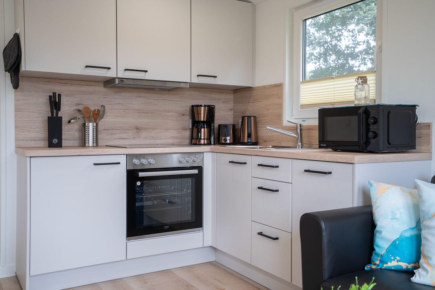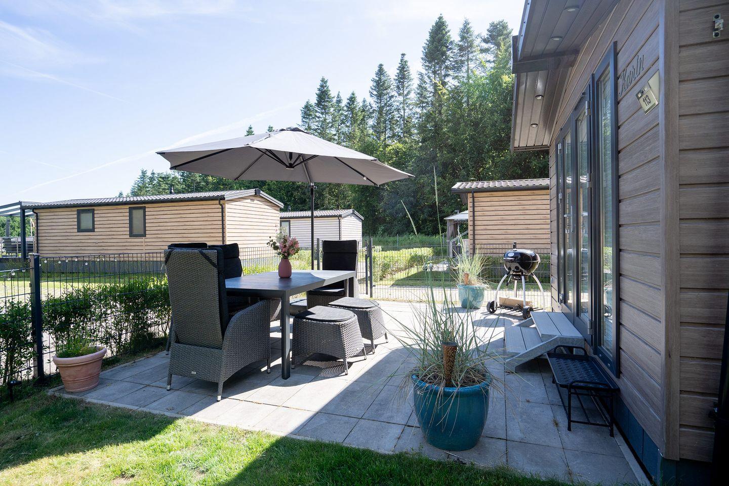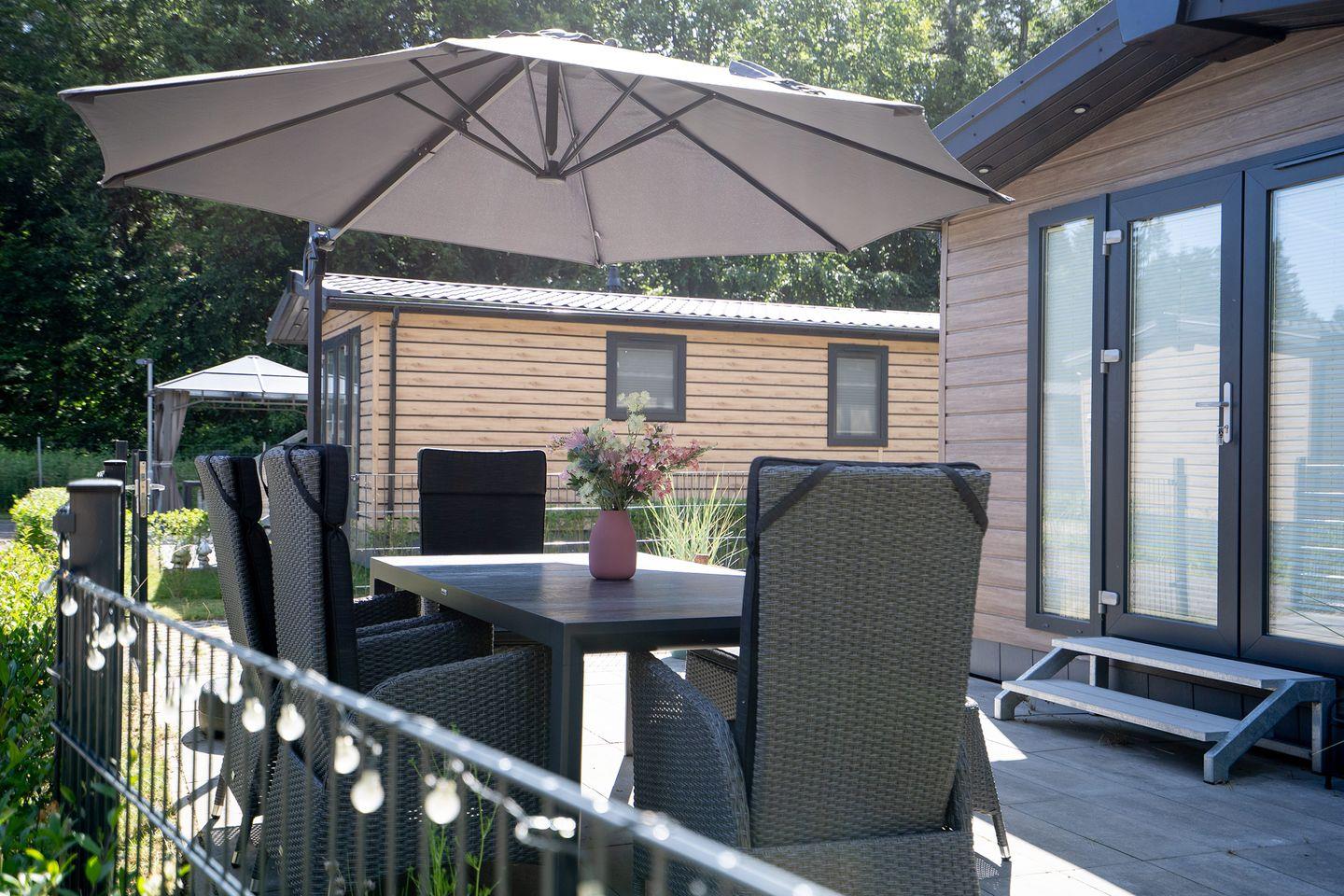 Ebenerdige Terrasse: Die großzügige, ebenerdige Terrasse ist ein Highlight dieses Ferienhauses. Genießen Sie Ihr Frühstück im Freien oder entspannen Sie sich am Abend bei einem Glas Wein, während Sie die ruhige Umgebung und die rauschenden Blätter des Waldes im Hintergrund erleben.