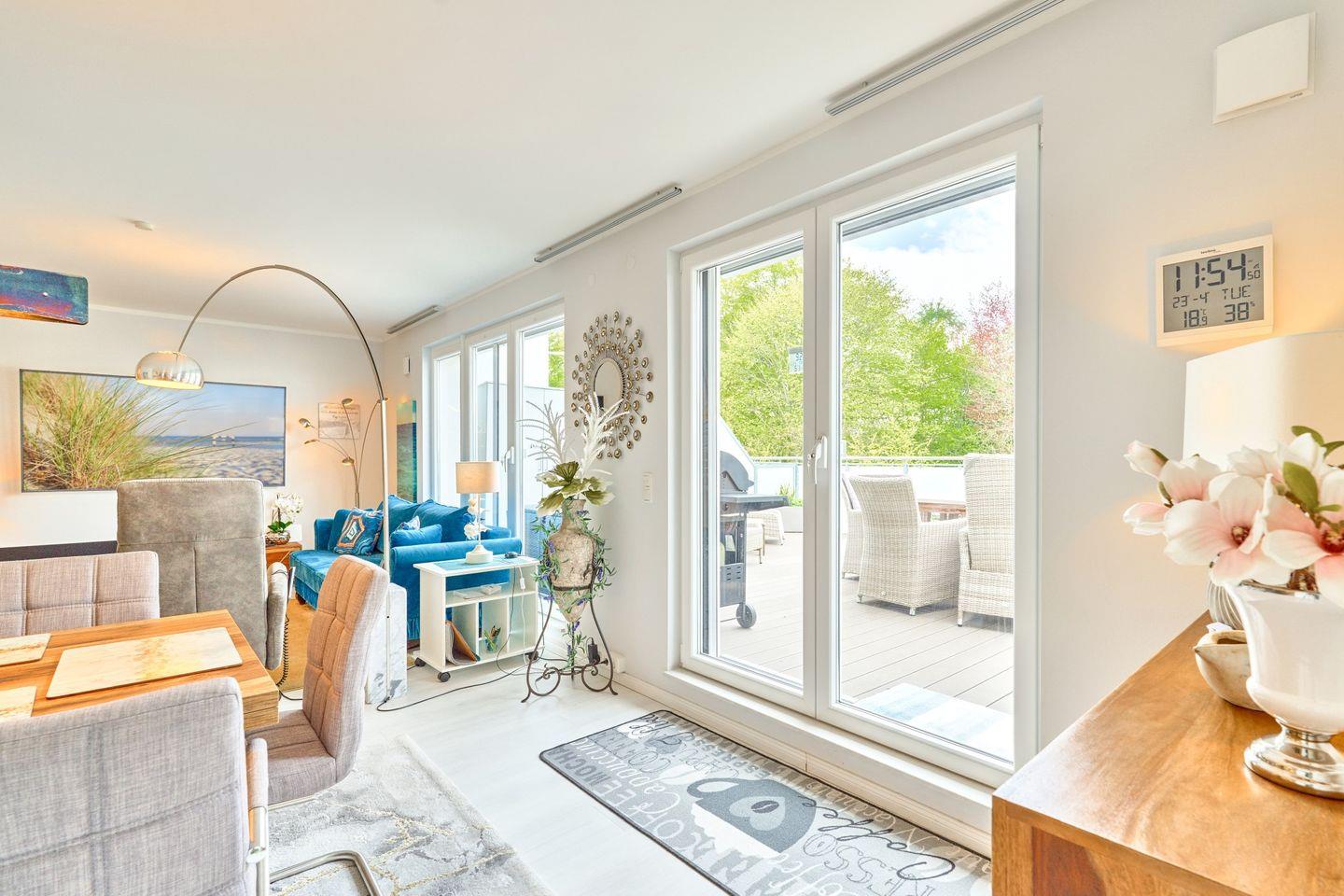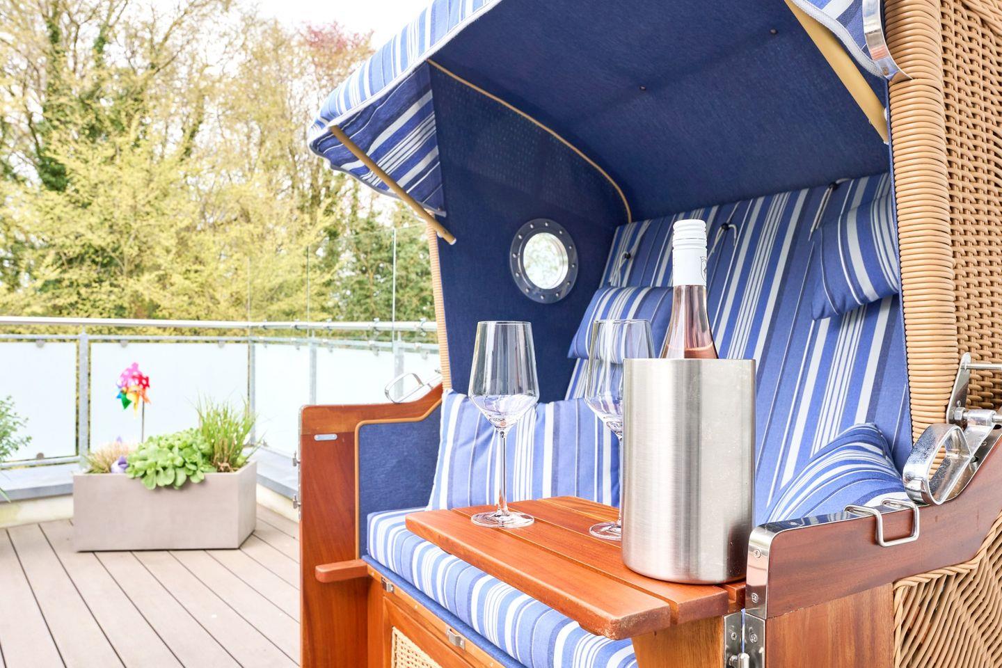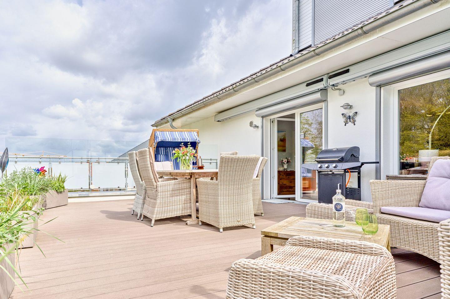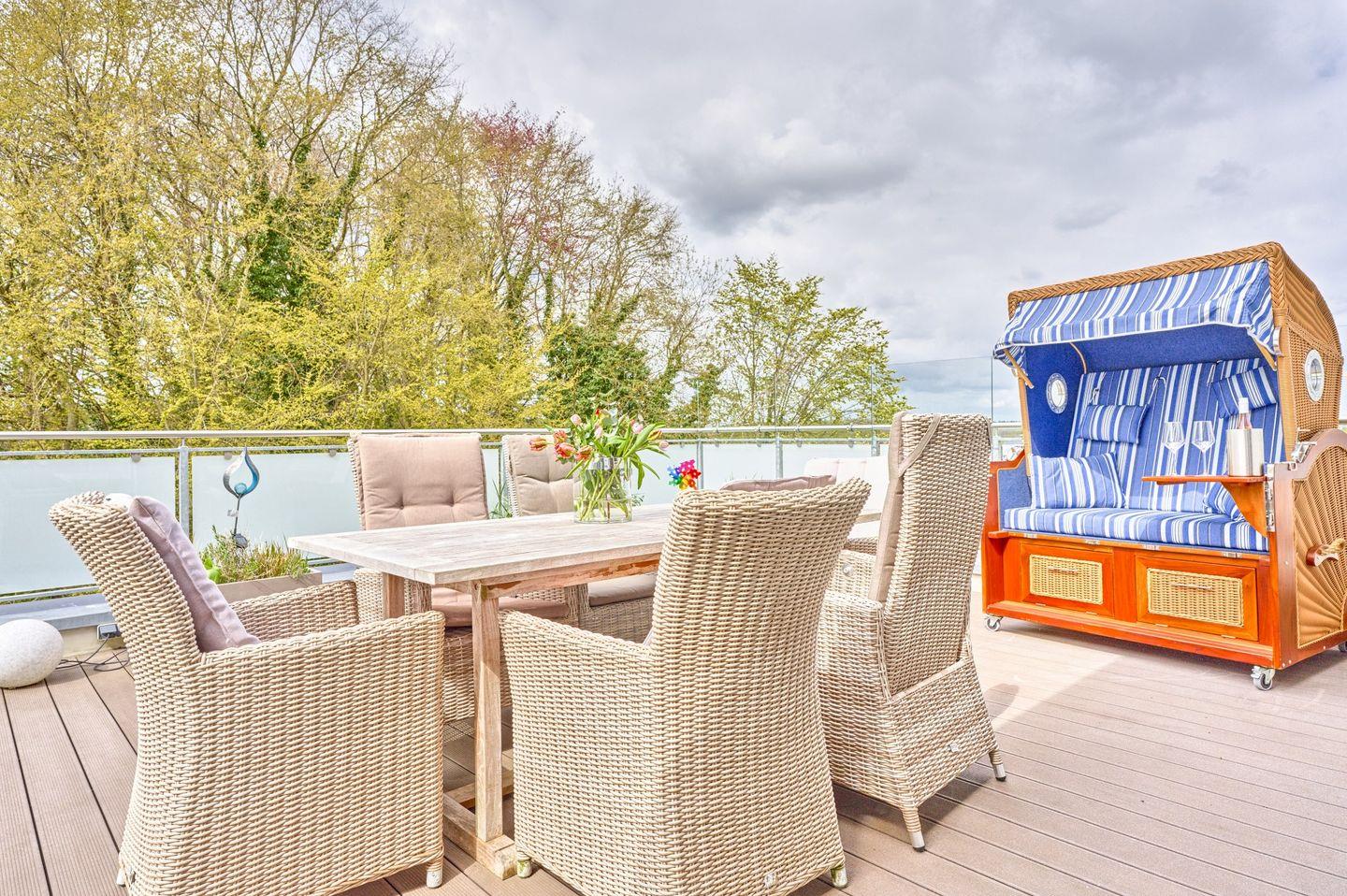 Ein Strandkorb lädt dazu ein, sich zurückzulehnen und die frische Meeresluft zu genießen, während Sie gleichzeitig vor Sonne und Wind geschützt sind. Erleben Sie die typische Ostsee-Entspannung in Ihrem eigenen kleinen Rückzugsort direkt auf der Terrasse.Zusätzlich dazu finden Sie bequeme Gartenmöbel auf der Terrasse, die ideal sind, um gemütlich zusammenzusitzen, zu plaudern und die Sonne zu genießen. Ob Sie sich beim Frühstück im Freien verwöhnen lassen oder den Tag bei einem Glas Wein ausklingen lassen möchten, diese Gartenmöbel bieten den perfekten Ort dafür.