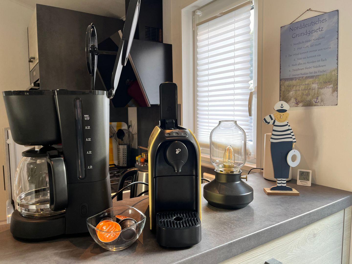 Küche: Kühlschrank mit Eisfach, 4-flammiger Gasherd, Spülmaschine, Backofen-/Mikrowellenkombination, Toaster, Kaffeemaschine, Wasserkocher, Pötte & Pannen, Geschirr, Gläser, Bestecke etc.