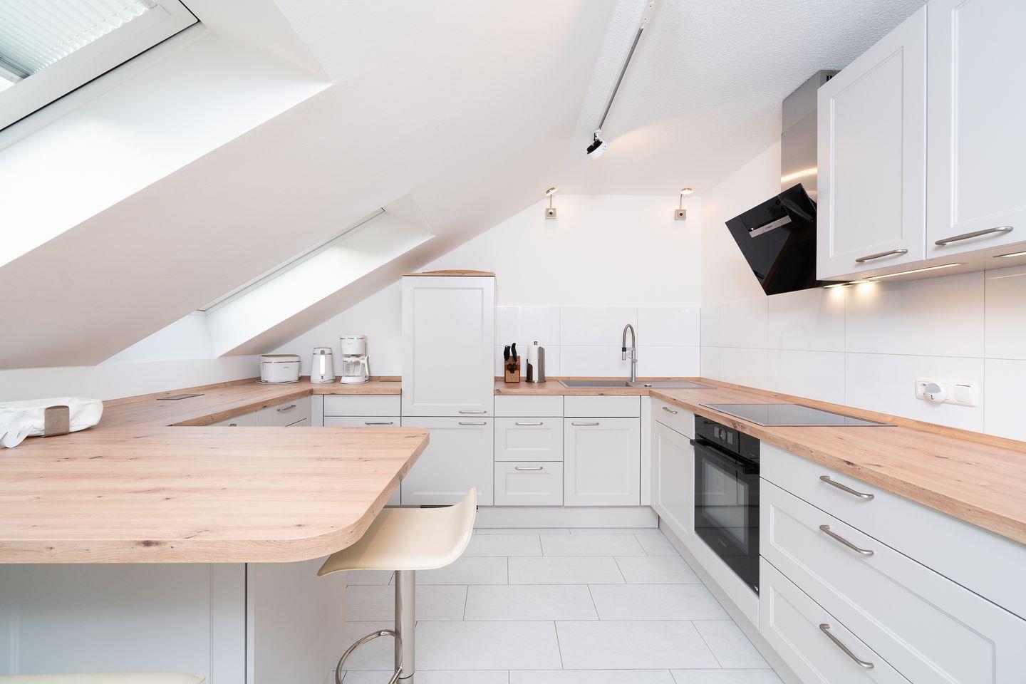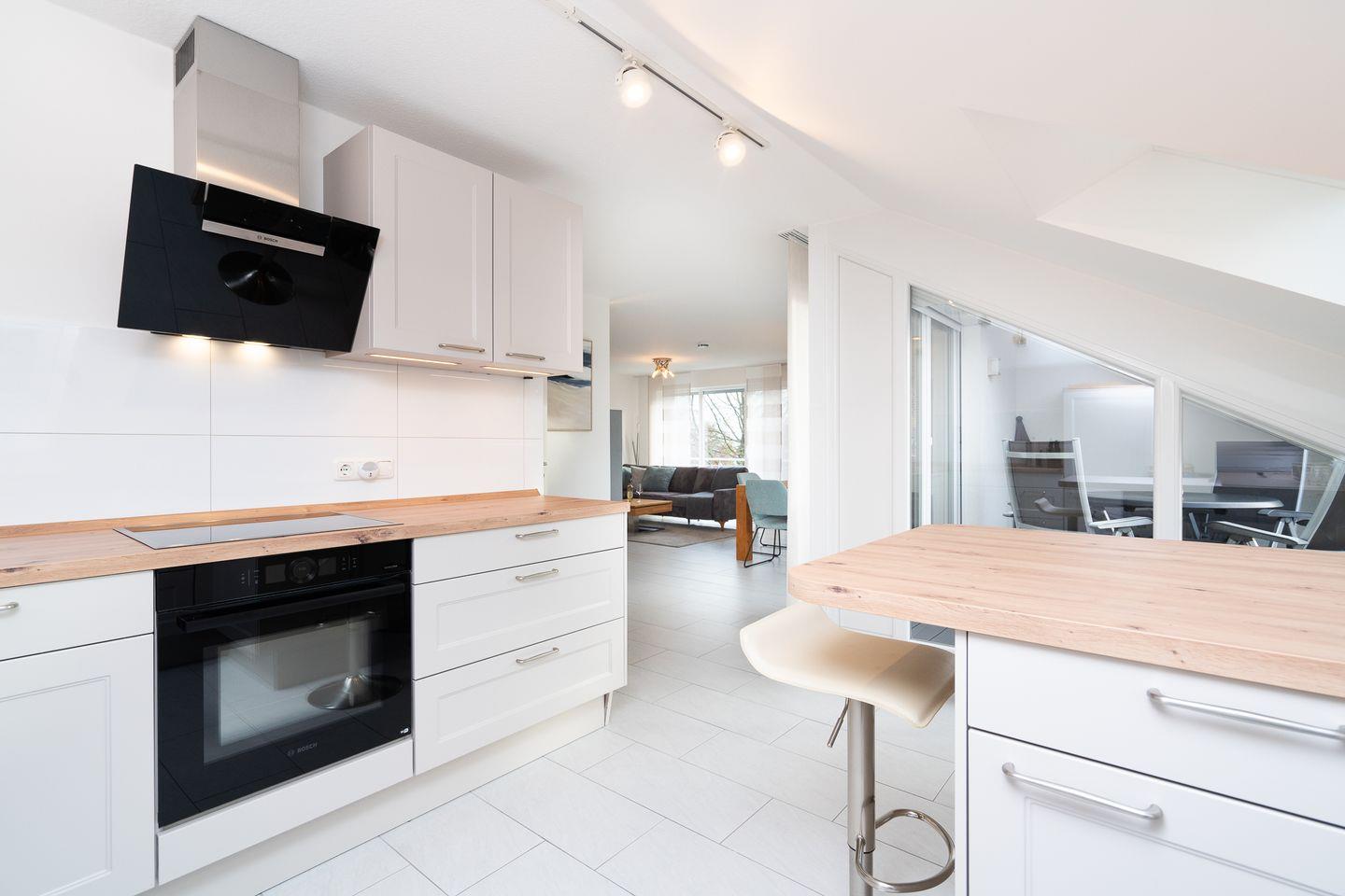 Der großzügig geschnittene Wohn-/Essbereich mit offener, voll ausgestatteter Küche und großen Fenstern sorgt für eine helle und freundliche Atmosphäre. Die gemütliche Sofaecke und der Essplatz neben der offenen Küche laden zum geselligen Beisammensein ein. Auf der schönen, geschützten Dachterrasse können Sie den Sonnenuntergang bei einem Sundowner in vollen Zügen genießen. Beide Schlafzimmer sind mit einem Doppelbett (1x 160 cm x 200 cm und 1x 200 cm x 200 cm Breite), jeweils einem Kleiderschrank und TV-Gerät ausgestattet.
