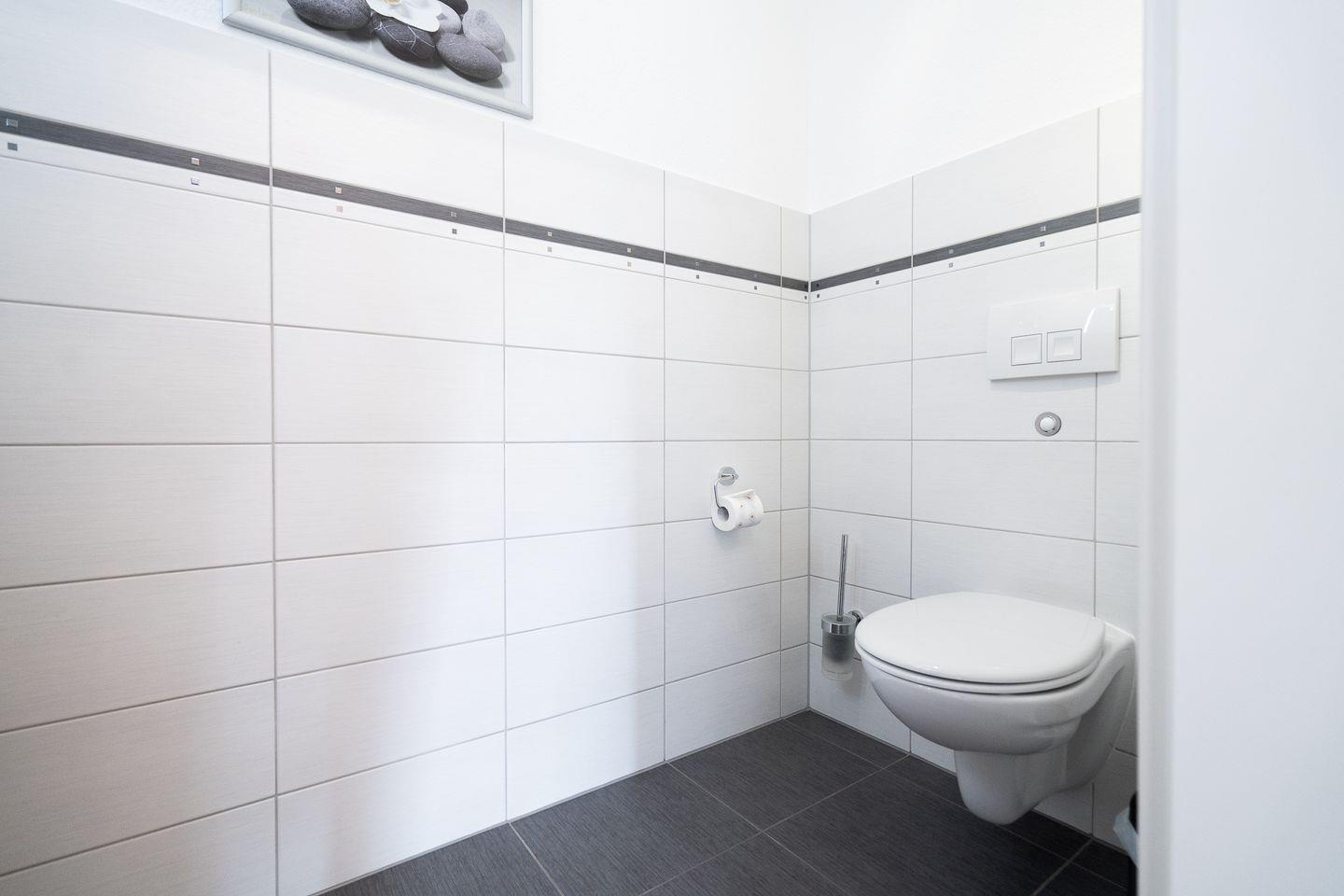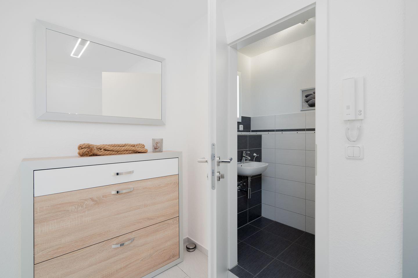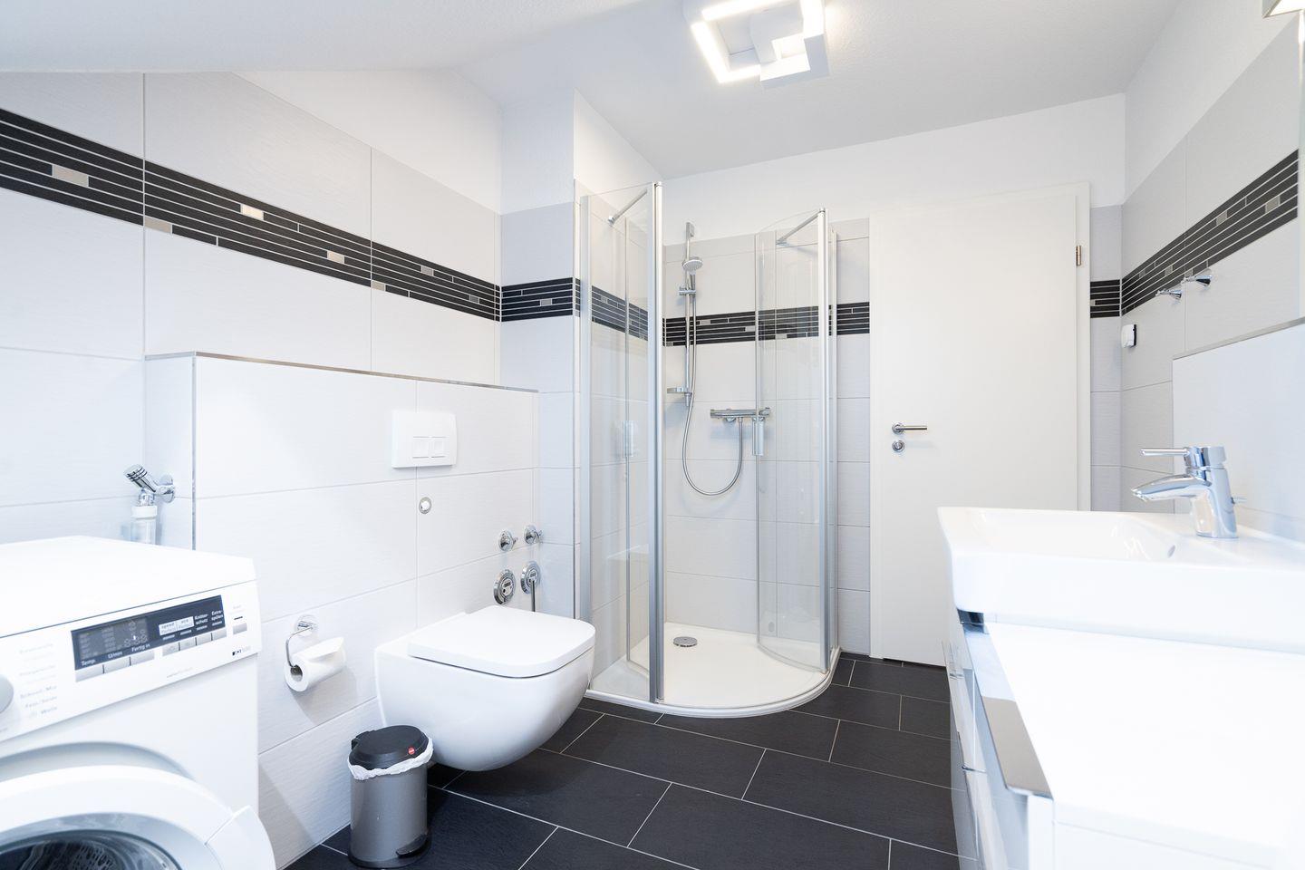 Das moderne und geräumige Badezimmer verfügt über eine bodentiefe Dusche und eine eigene Waschmaschine und -trockner. Zusätzlich gibt es ein separates Gäste-WC.