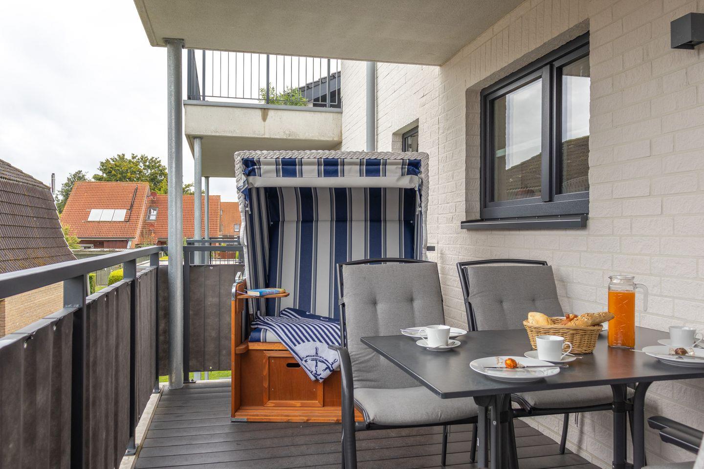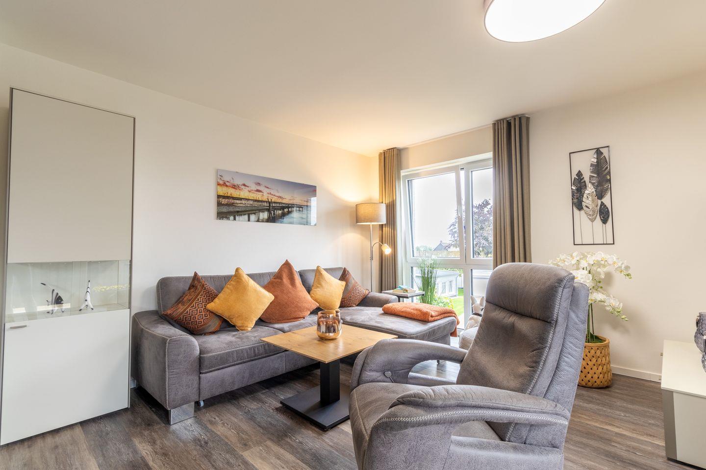 Im offenen Wohnbereich mit gemütlichem Schlafsofa, Smart-TV und Essplatz kannst du entspannen und gemeinsame Stunden verbringen. Vom Wohnzimmer aus erreichst du den möblierten Balkon – perfekt für das erste Käffchen am Morgen oder einen Aperitif zum Sonnenuntergang. Die moderne Küche ist voll ausgestattet, inklusive Geschirrspüler, Backofen, Kaffeemaschine und mehr.