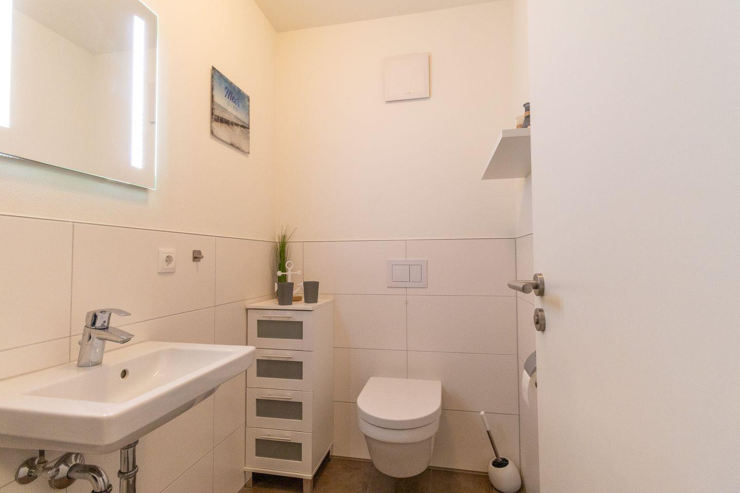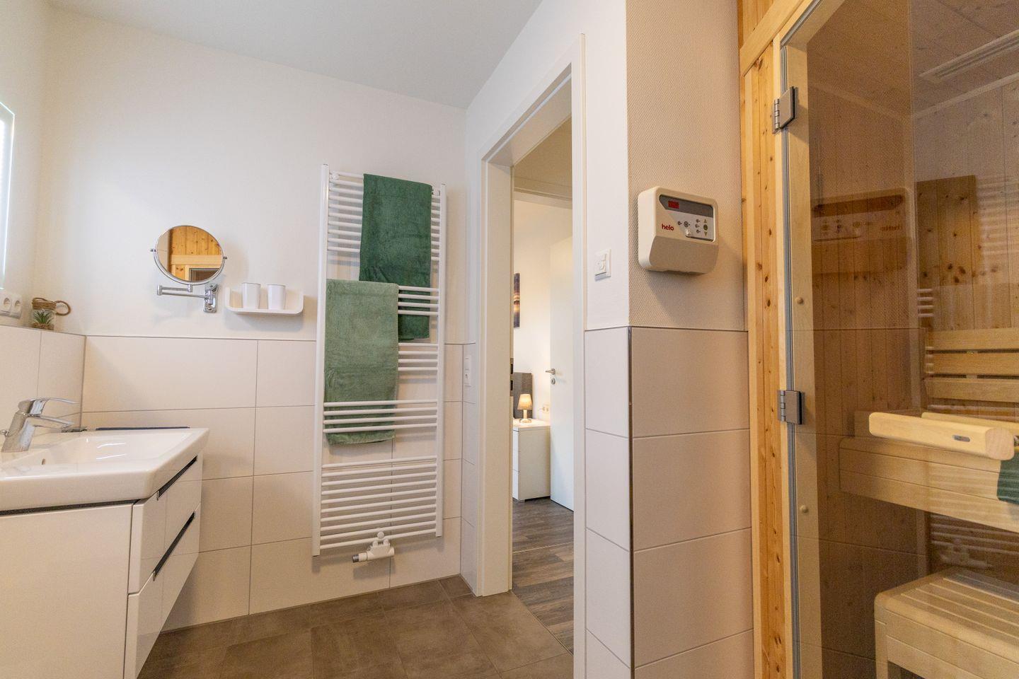 Das moderne Tageslichtbad ist mit einer ebenerdigen Dusche, einer Sauna, Waschbecken, WC und Handtuchwärmer ausgestattet. Hier startest du frisch in den Tag oder entspannst dich nach einem ausgedehnten Strandspaziergang.