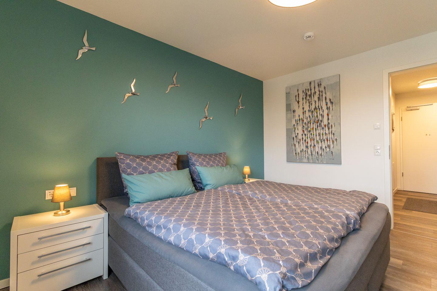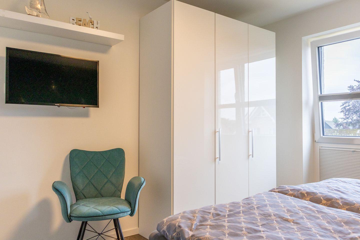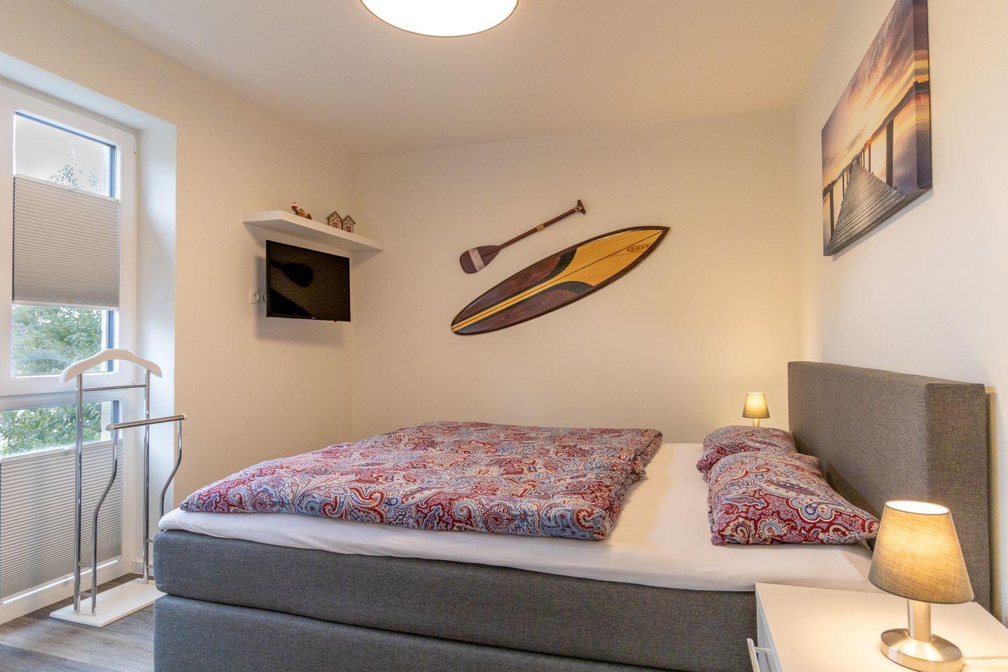 Zwei gemütliche Schlafzimmer bieten jeweils ein komfortables Doppelbett (je 180 x 200 cm) – ideal für Paare, Freunde oder Familien. Beide Räume verfügen über ausreichend Stauraum und lassen sich bei Bedarf verdunkeln – für erholsame Nächte nach einem Tag an der Ostsee.